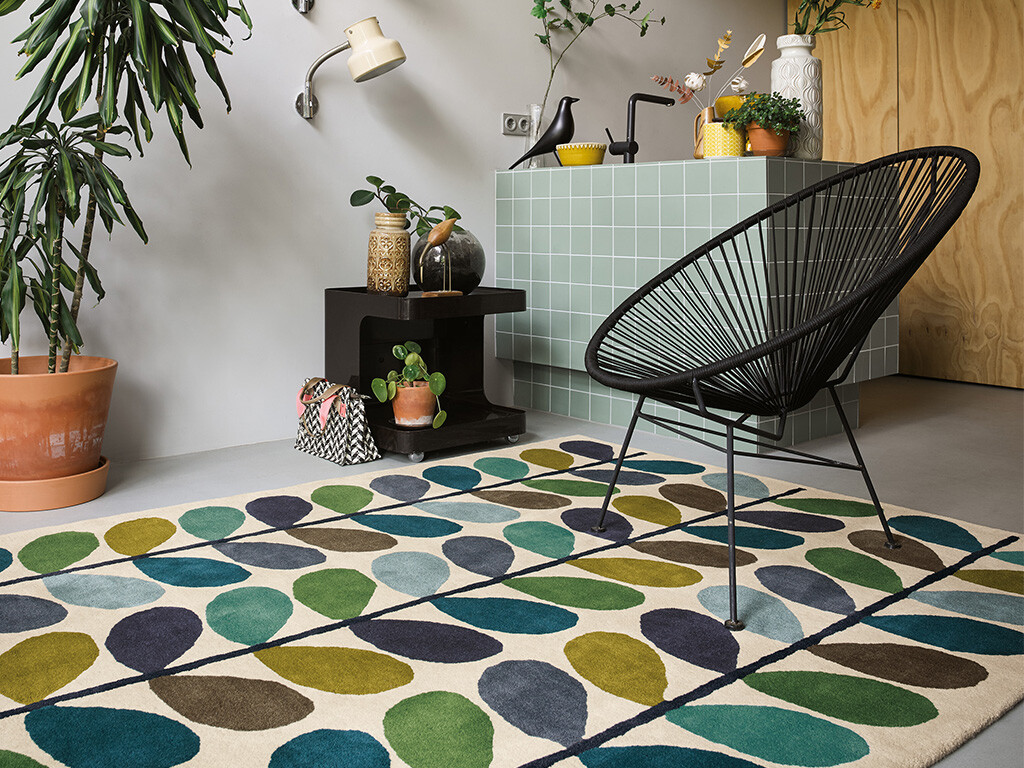 Gulvtepper, håndknyttede i ull, flatvevde til utestuen. Gulvtepper fra Morris, Orla Kiely, Laura Ashley m.fl til ute og inne.