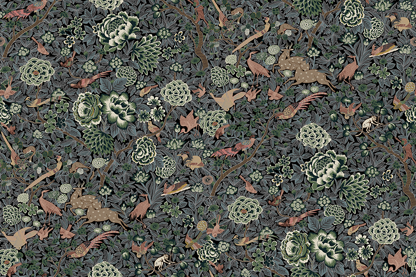 Forest Scene, fløyelsstoff med skogsscener i blått og fersken på midnattsblå bunn