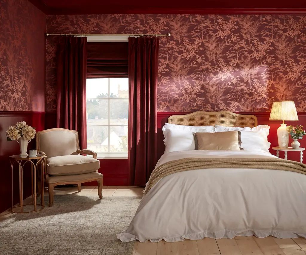 Mystic Divine Damson, tapet med metallisk skog på dyp rød bunn
