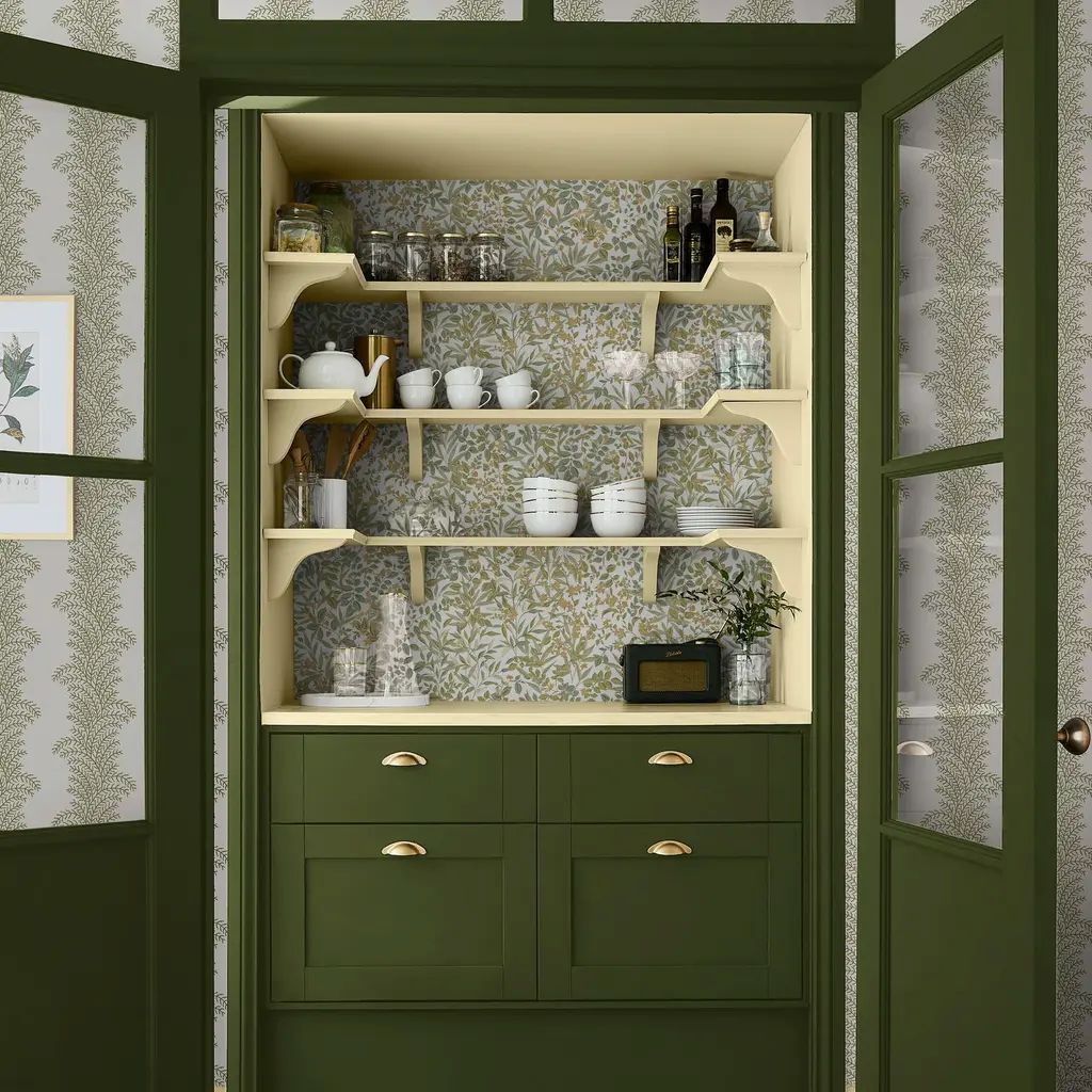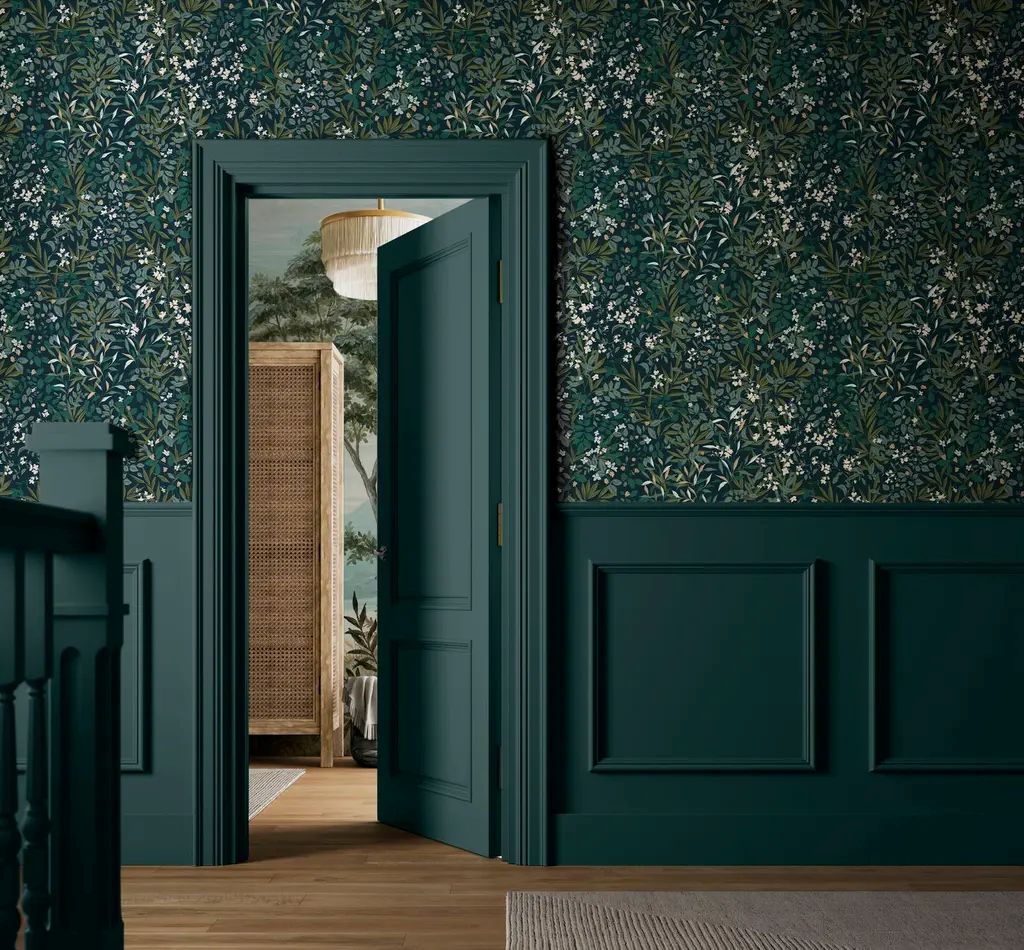 Rivington Folly, arkitektonisk tapet med trær og landskap i grønt