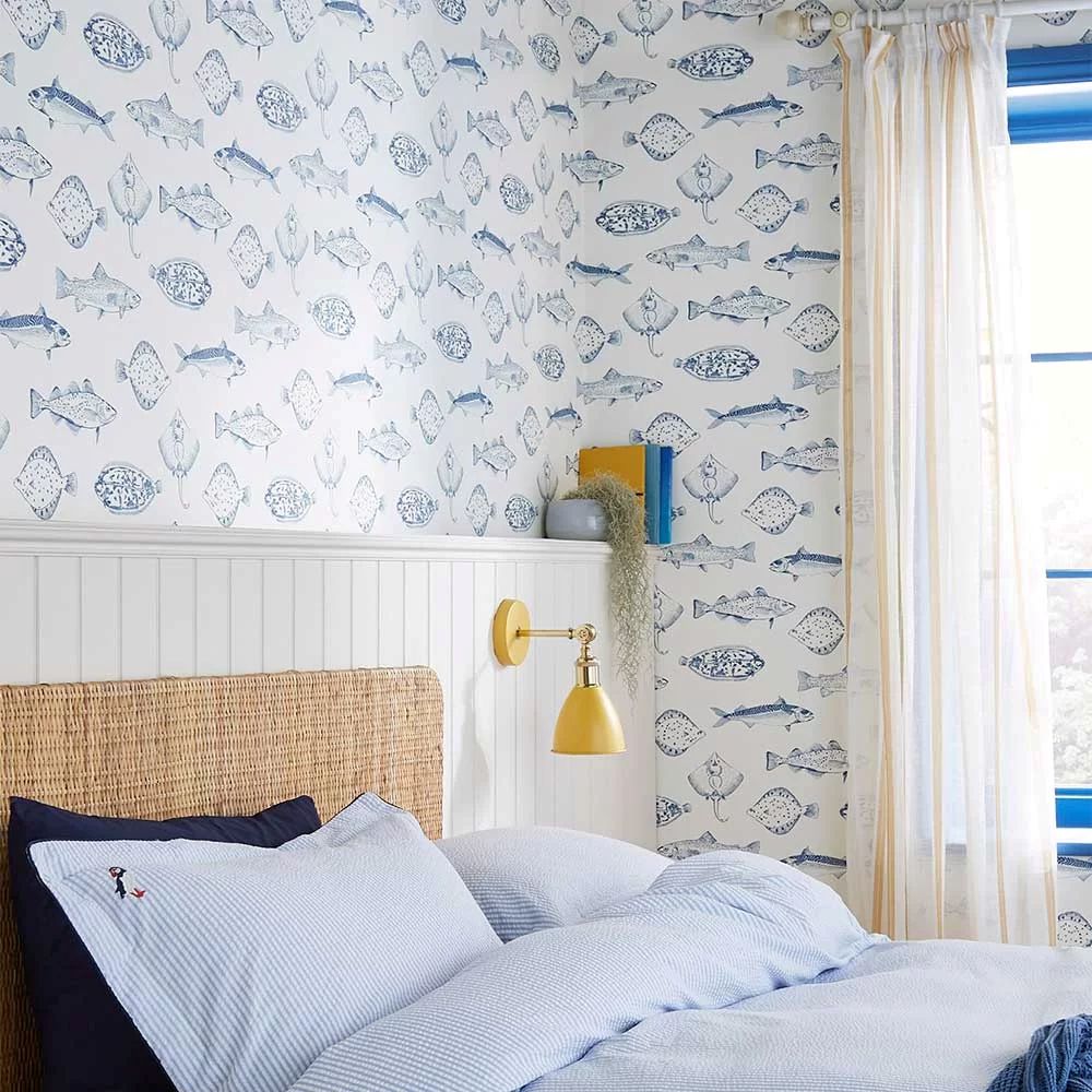 Name the Plaice, tapet med fisker i blått på hvit bunn