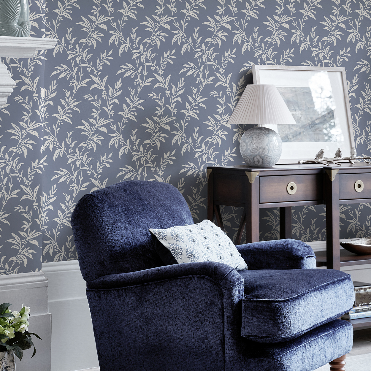 Paxford Leaves, moderne tapet med bladmønster i mørk blå