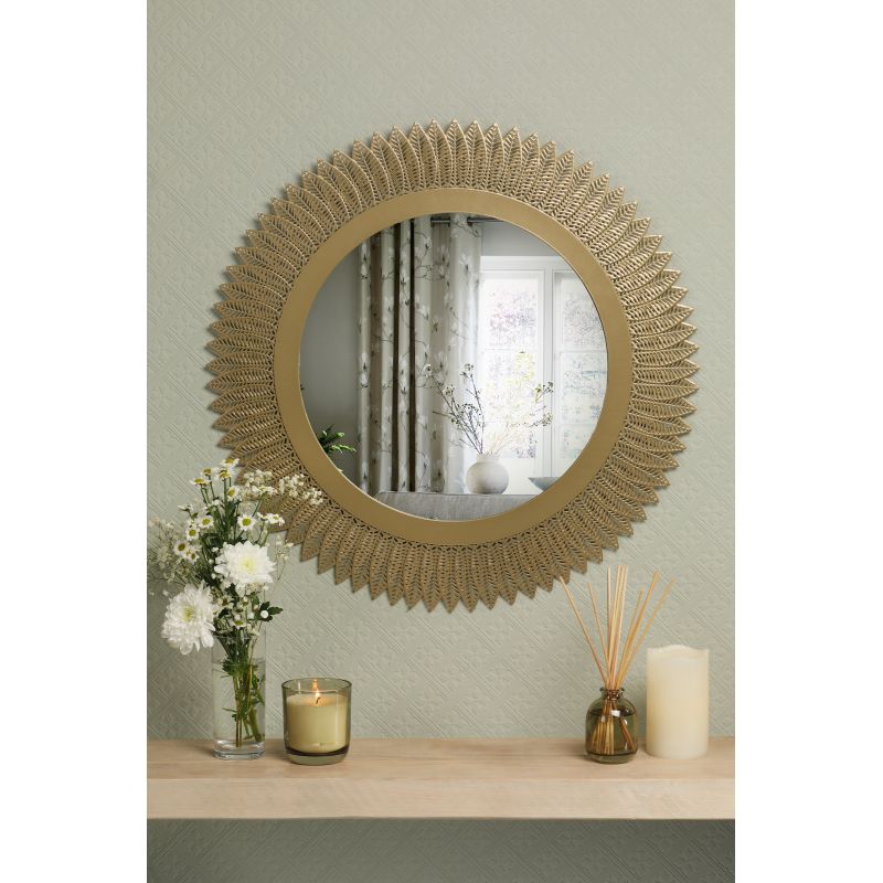 Rushden, rundt speil med bladformede detaljer i børstet gull