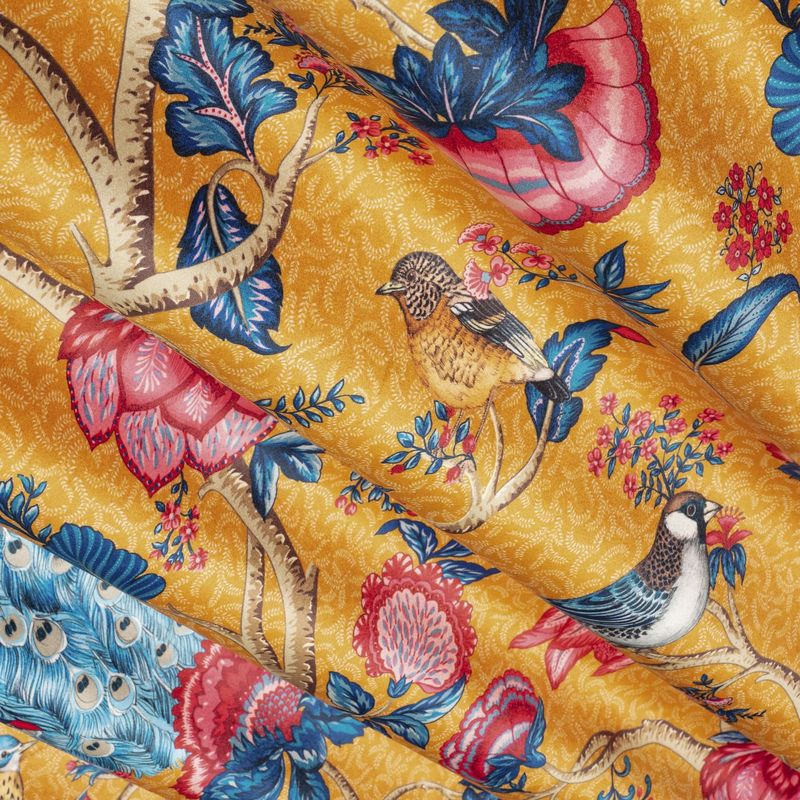 Alexandra, et vakkert gardin/møbelstoff i fløyel, her med påfugler og blomster på gul bunn. Et vakkert og lekkert stoff som vil gi en luksuriøs følelse.