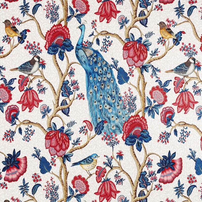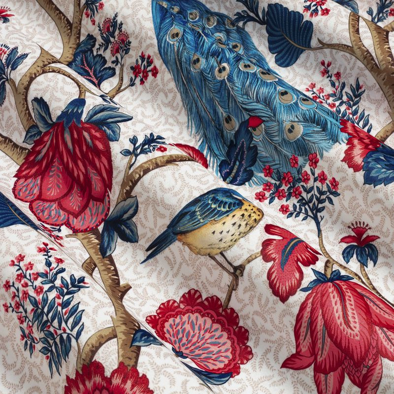 Alexandra, et vakkert gardin/møbelstoff i fløyel, her med påfugler og blomster på offwhite bunn. Et vakkert og lekkert stoff som vil gi en luksuriøs følelse.
