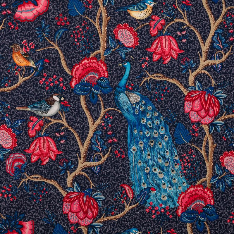 Alexandra, gardinstoff med påfugler på marineblå bunn (dobbel bredde)
