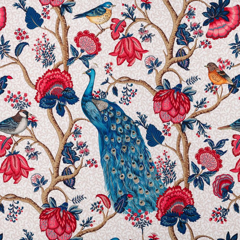 Alexandra, et vakkert gardinstoff i dobbel bredde, her med påfugler og blomster på offwhite bunn. Et delikat og lett stoff i 100% bomullsperscale.. Kan benyttes både som gardinstoff og møbelstoff med sine 25000 Martindale.