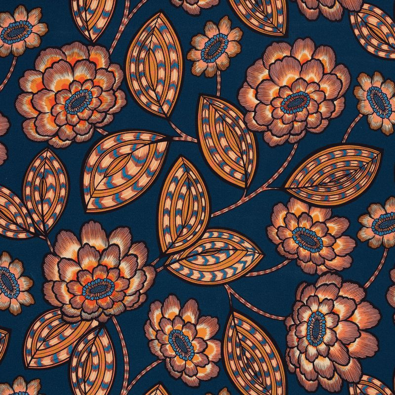 Aline, stoff med stilisert blomstermønster på marineblå bunn fra InkFabrik