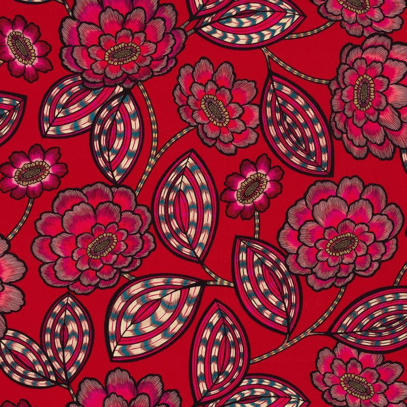 Aline, stoff med stilisert blomstermønster på rød bunn fra InkFabrik