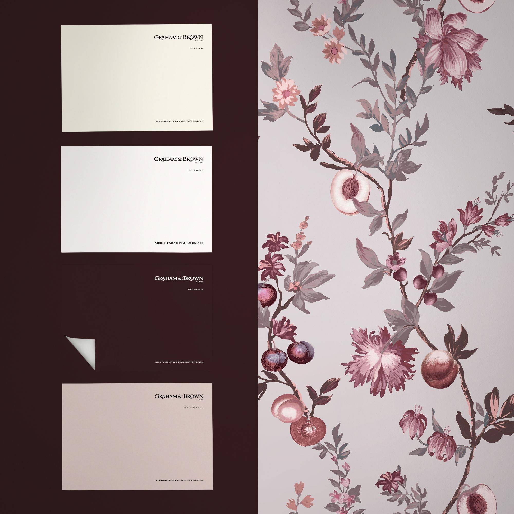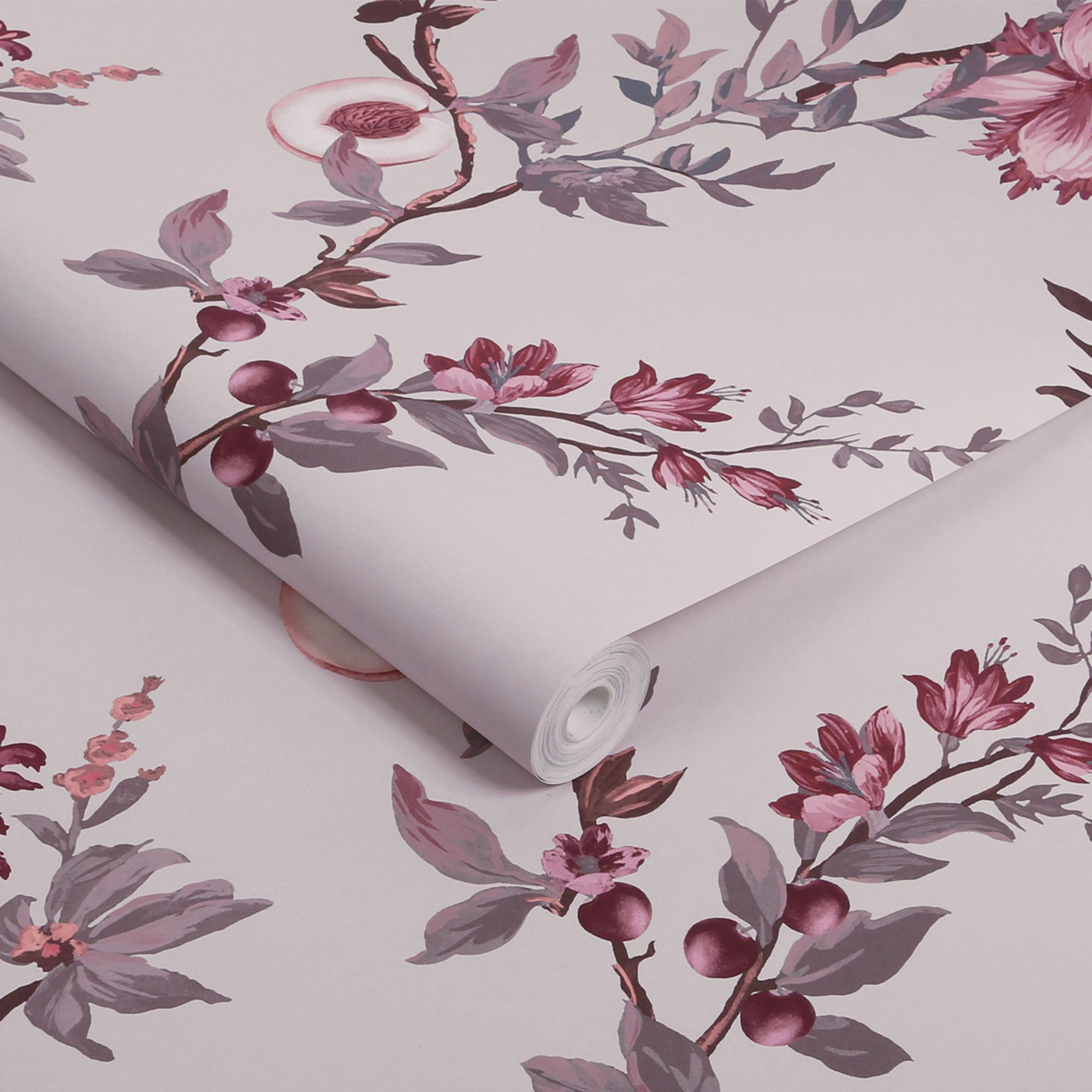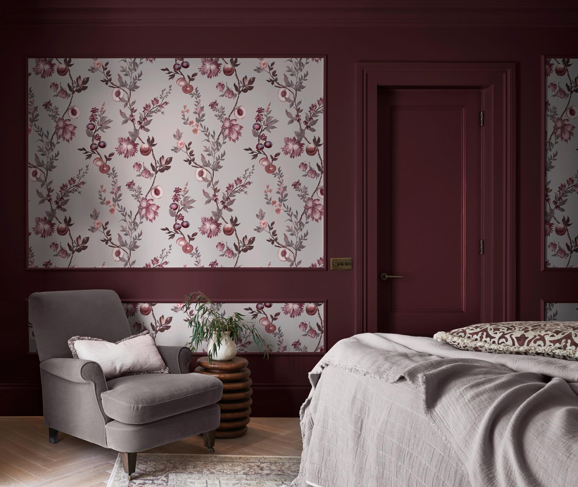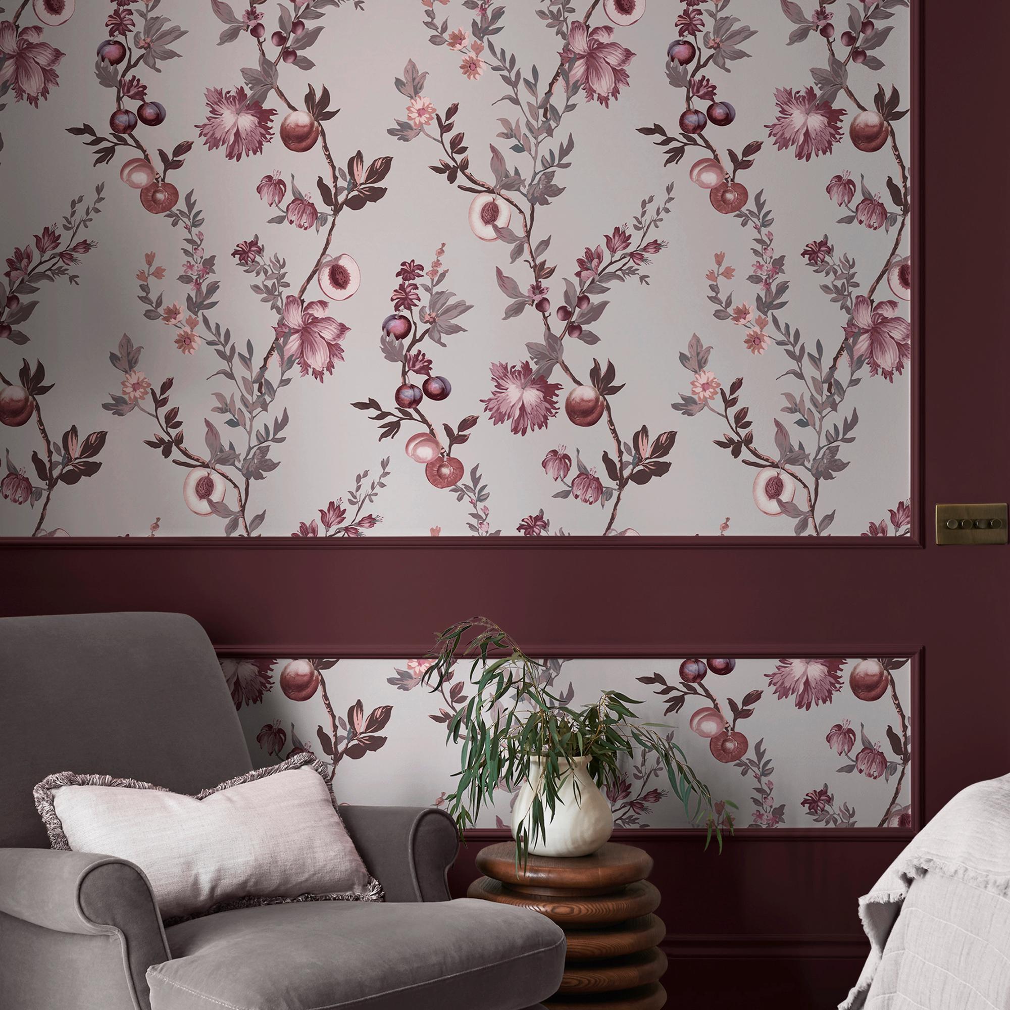The Allurium Pink wallpaper brings a soft sense of storytelling to the walls. Flowing branches of fruit and florals unfolding across a gentle blush background. Fruits and pink-hued blooms are painted in layered tones of mauve, damson and dusty rose.