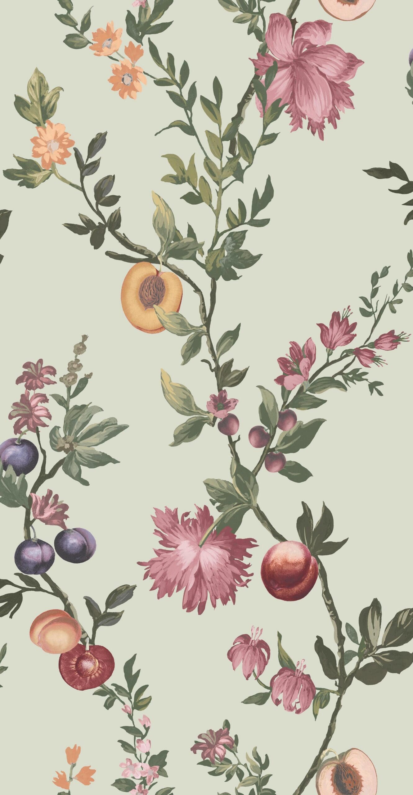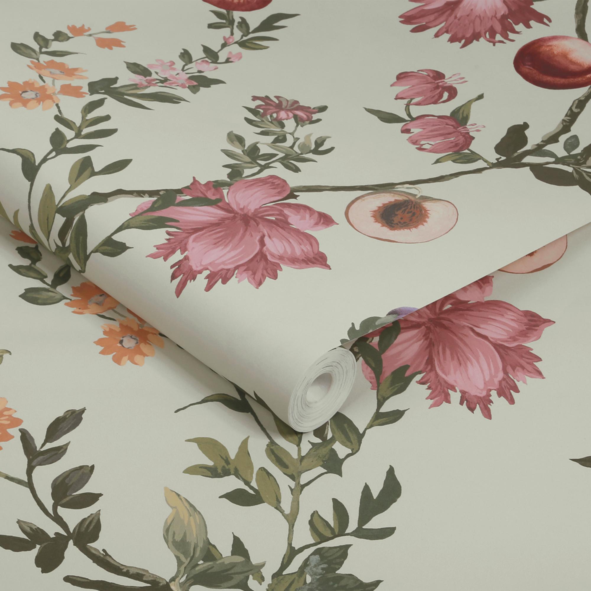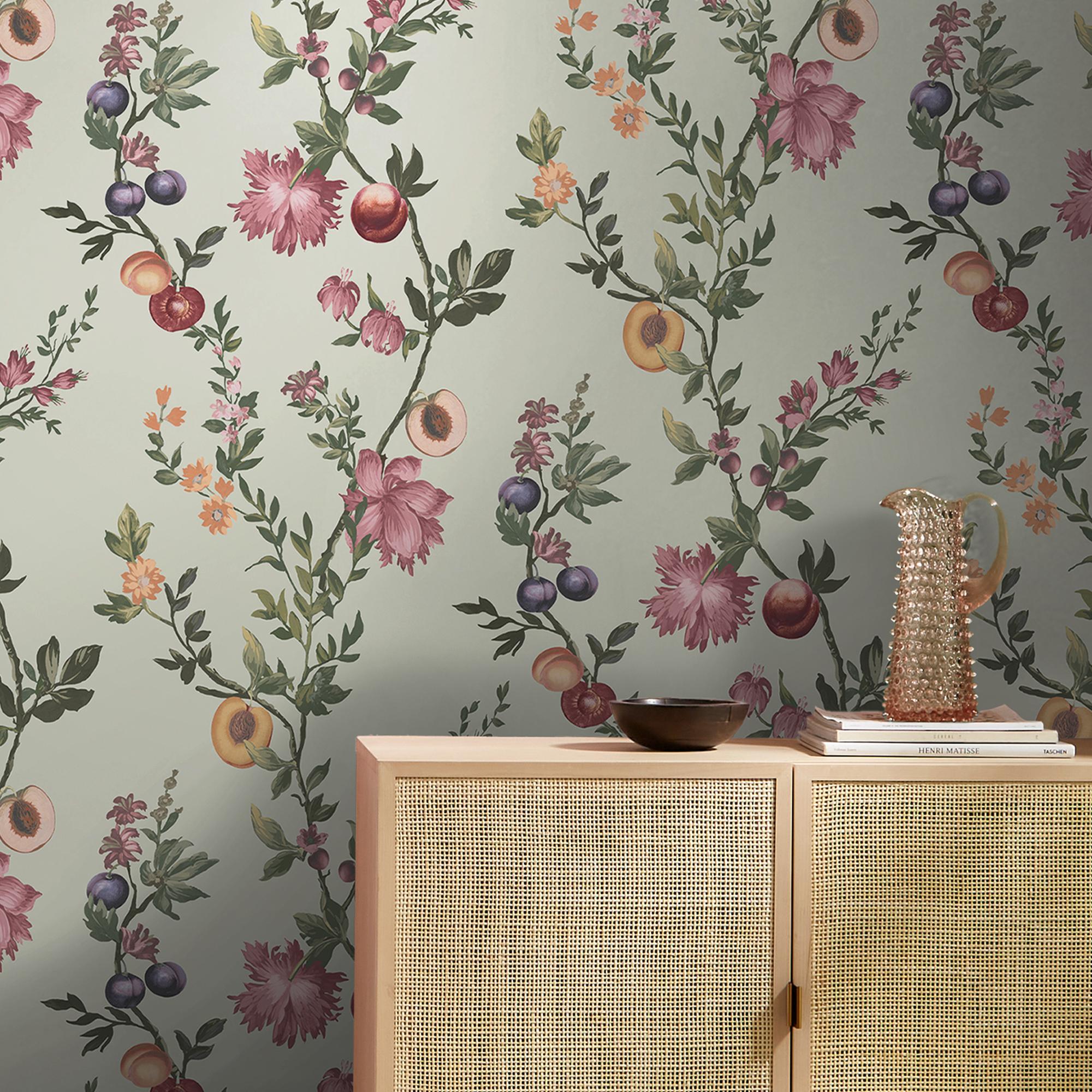The Allurium Sage wallpaper brings a botanical still life to the walls, trailing branches adorned with ripened fruit, delicate florals, and leafy foliage, all painted in a romantic palette.