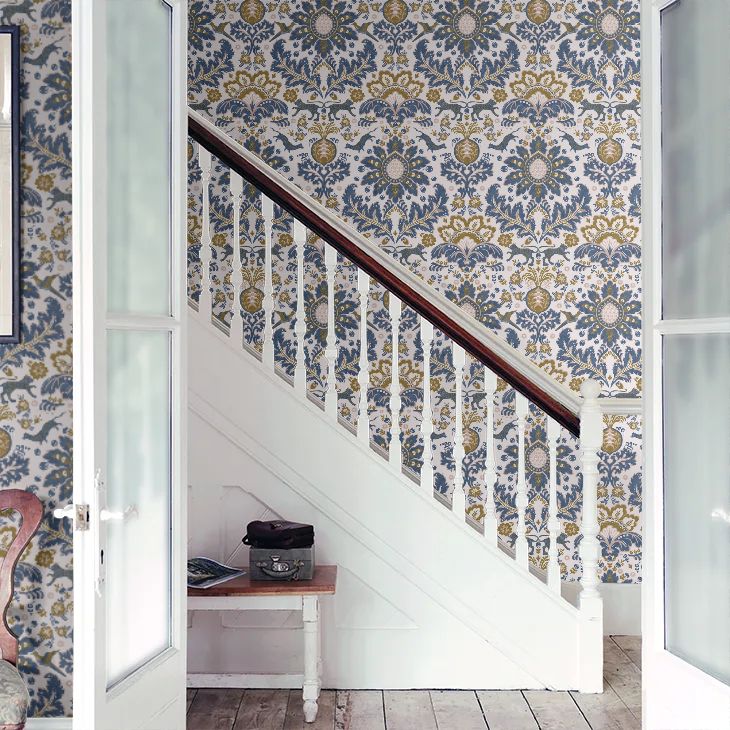 A wonderful design featuring a classic damask style, with a animalistic touch, tigers and birds adorn this design surrounded by flowers and leaves, in a striking colourway. Seen here in the Cream / Blue / Gold colourway.