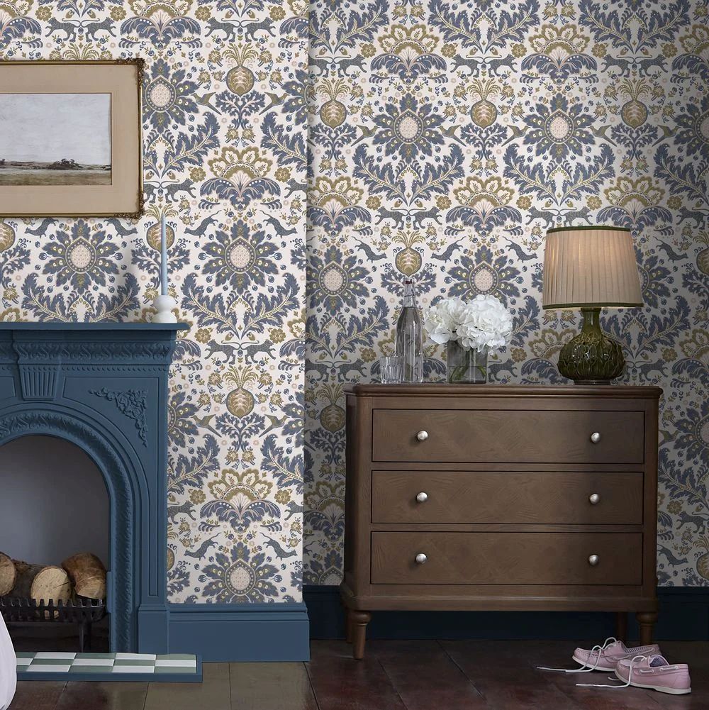 Animal Damask, tapet med dyrisk damaskmønster i blått fra Joules