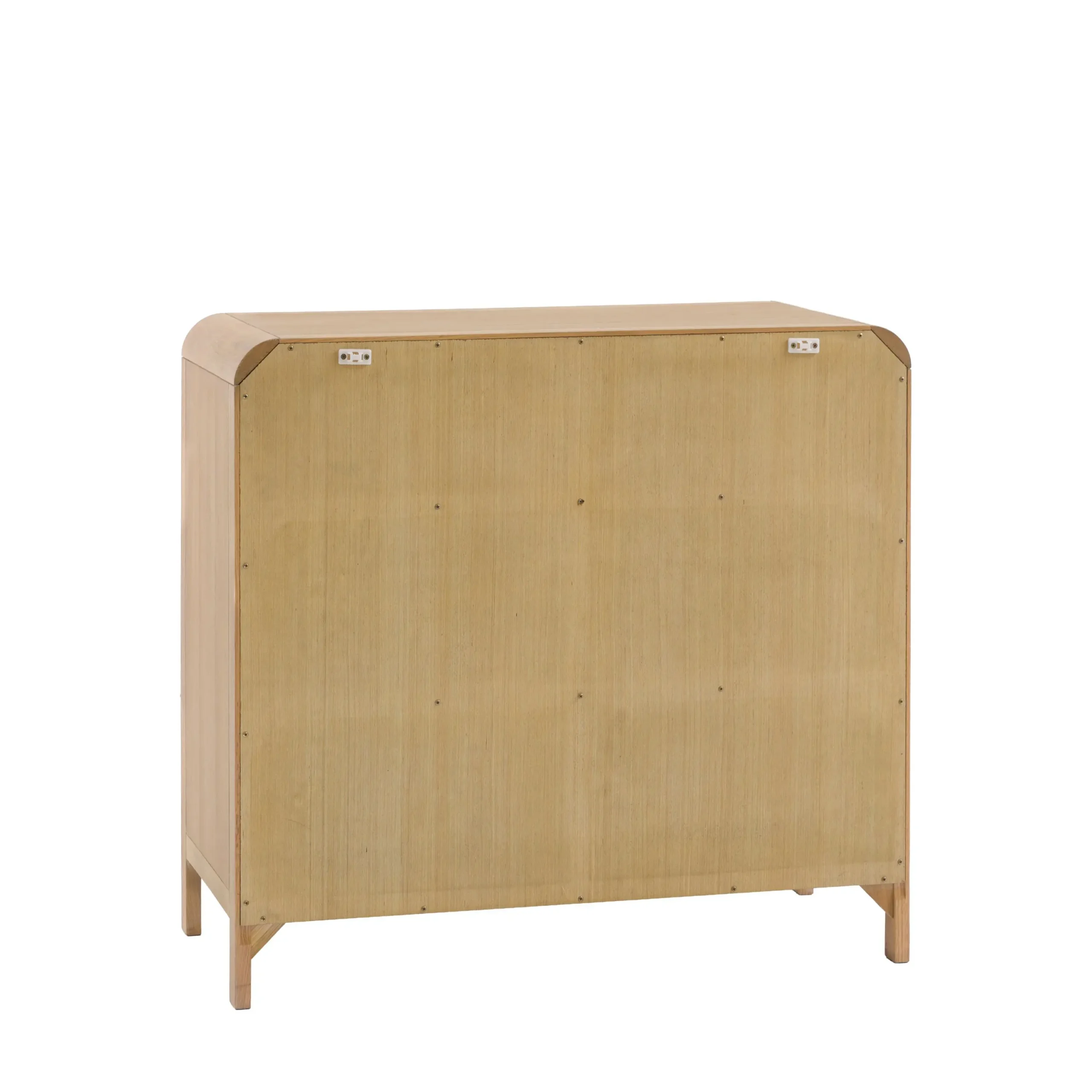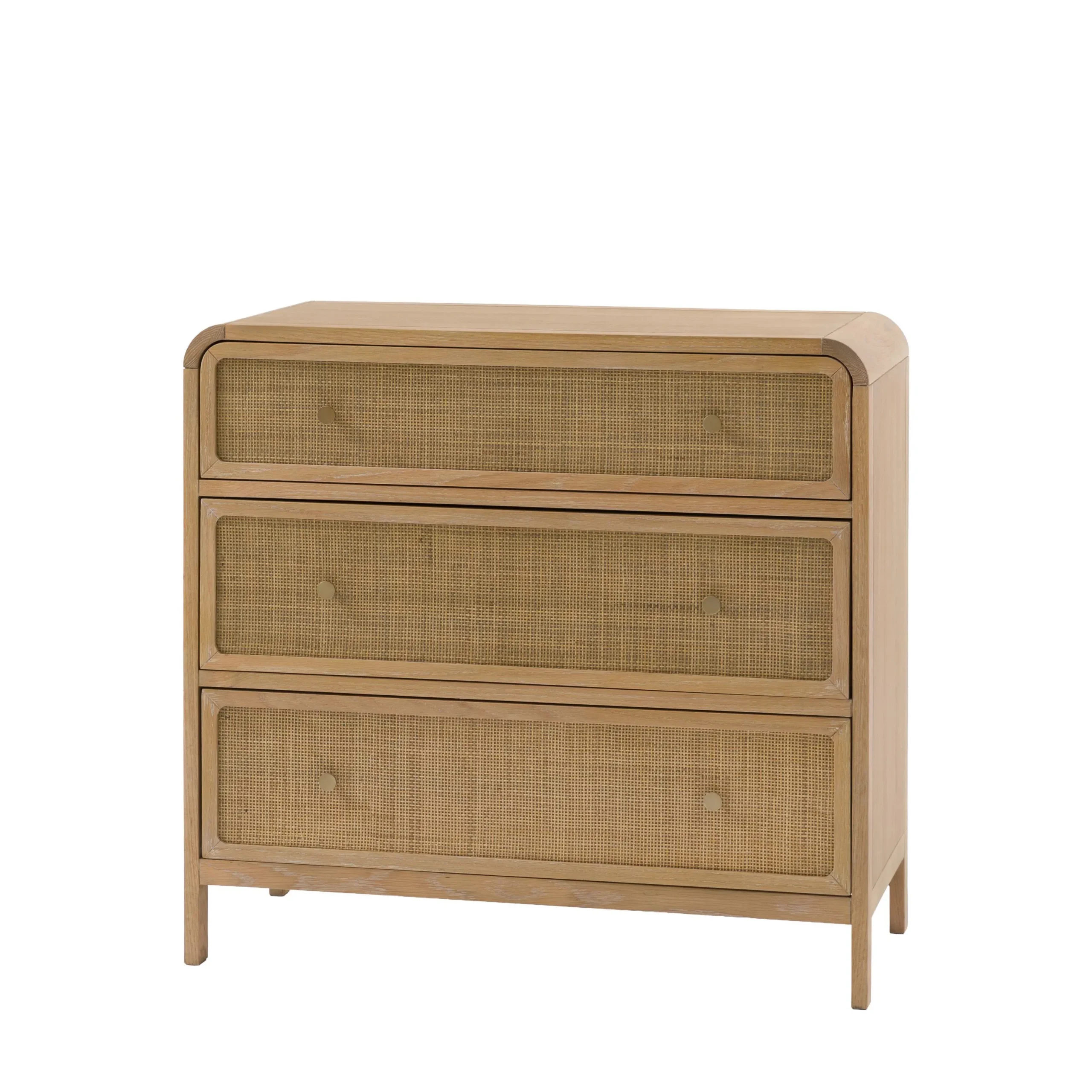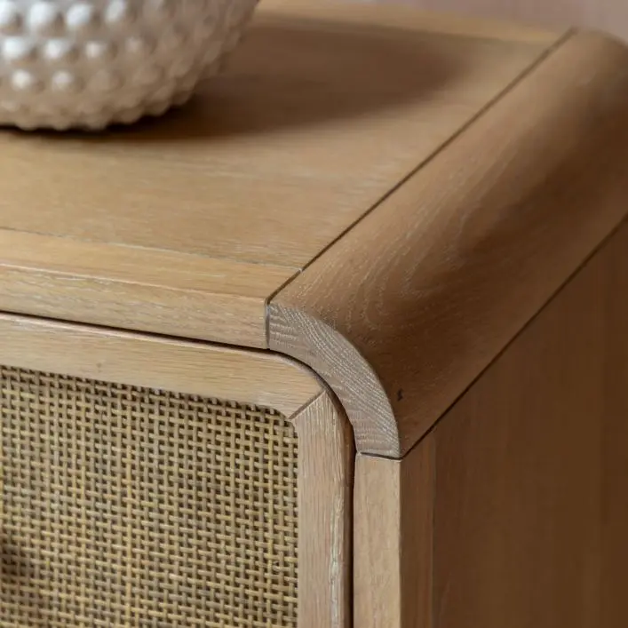 The standout feature being the natural hand-woven rattan, adding texture and an artisanal feel. Finished in a soft lime-washed tone, the collection has a relaxed, lived-in character. Gently curved tops lend a sense of softness, while bronzed metal handles add a subtle vintage touch.