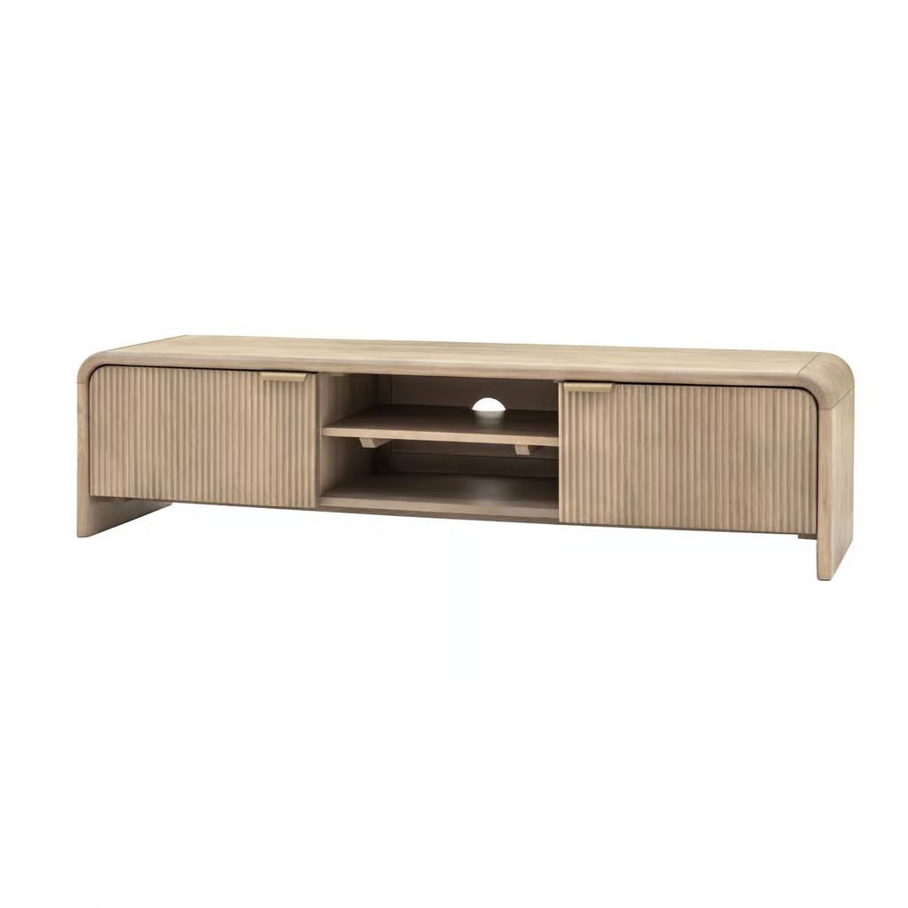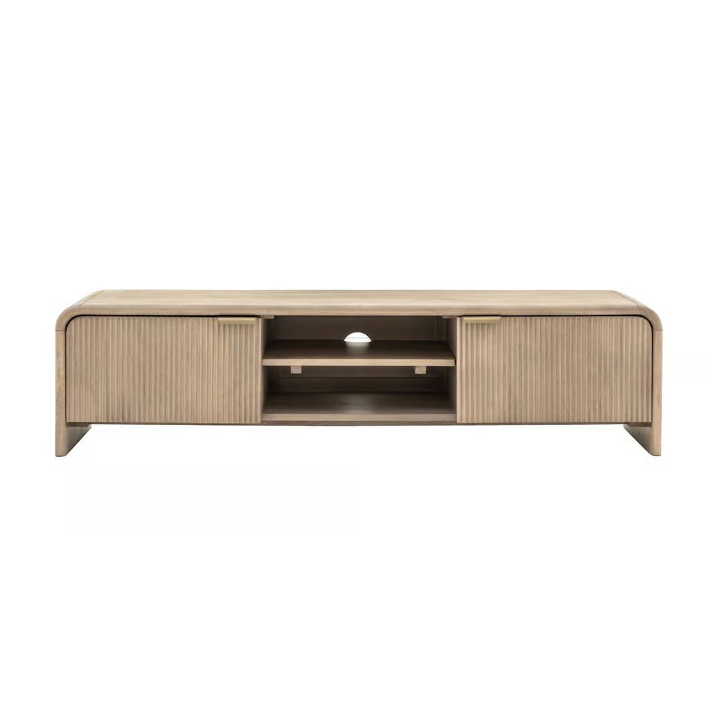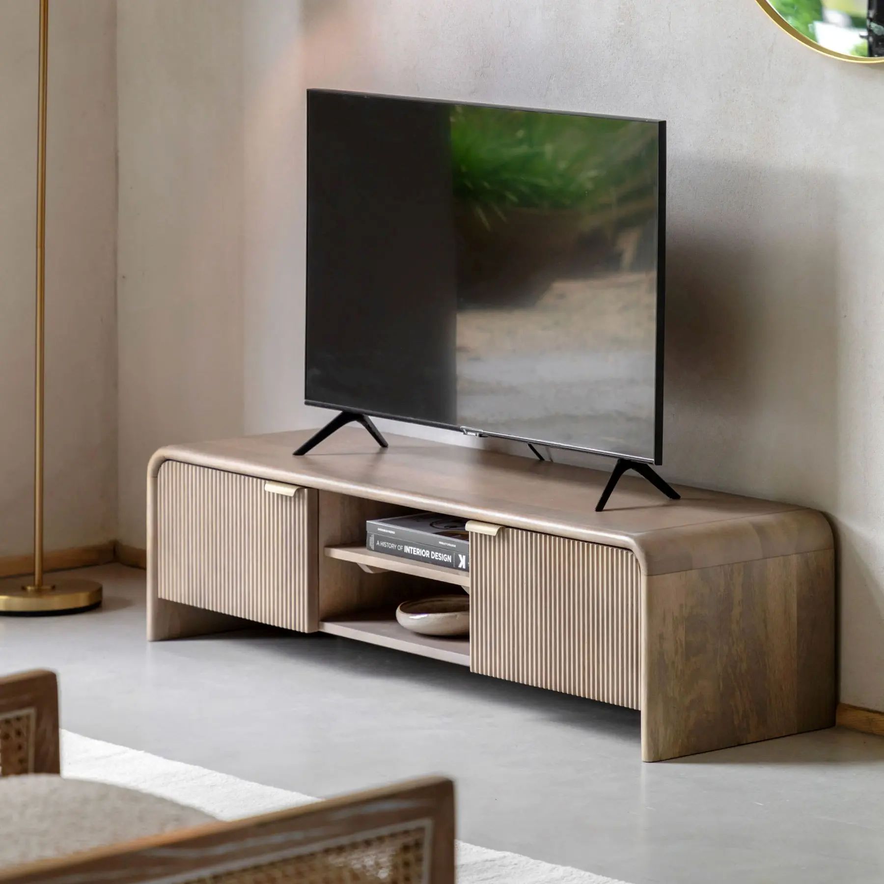 This media unit is a functional and stylish solution for media storage. With a curved top and fluted door detailing, it provides ample space for entertainment essentials. The sleek design fits effortlessly into modern living spaces, offering both organization and aesthetic appeal.