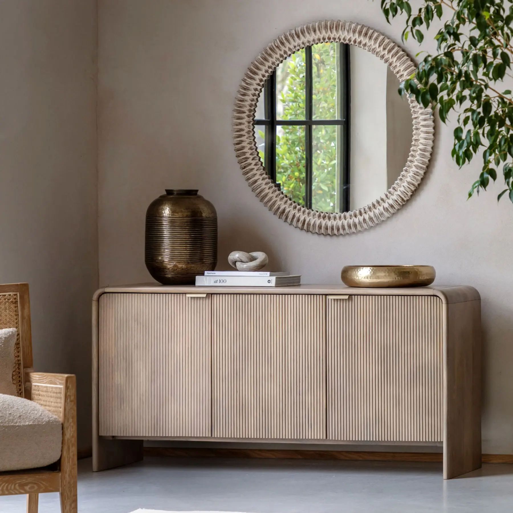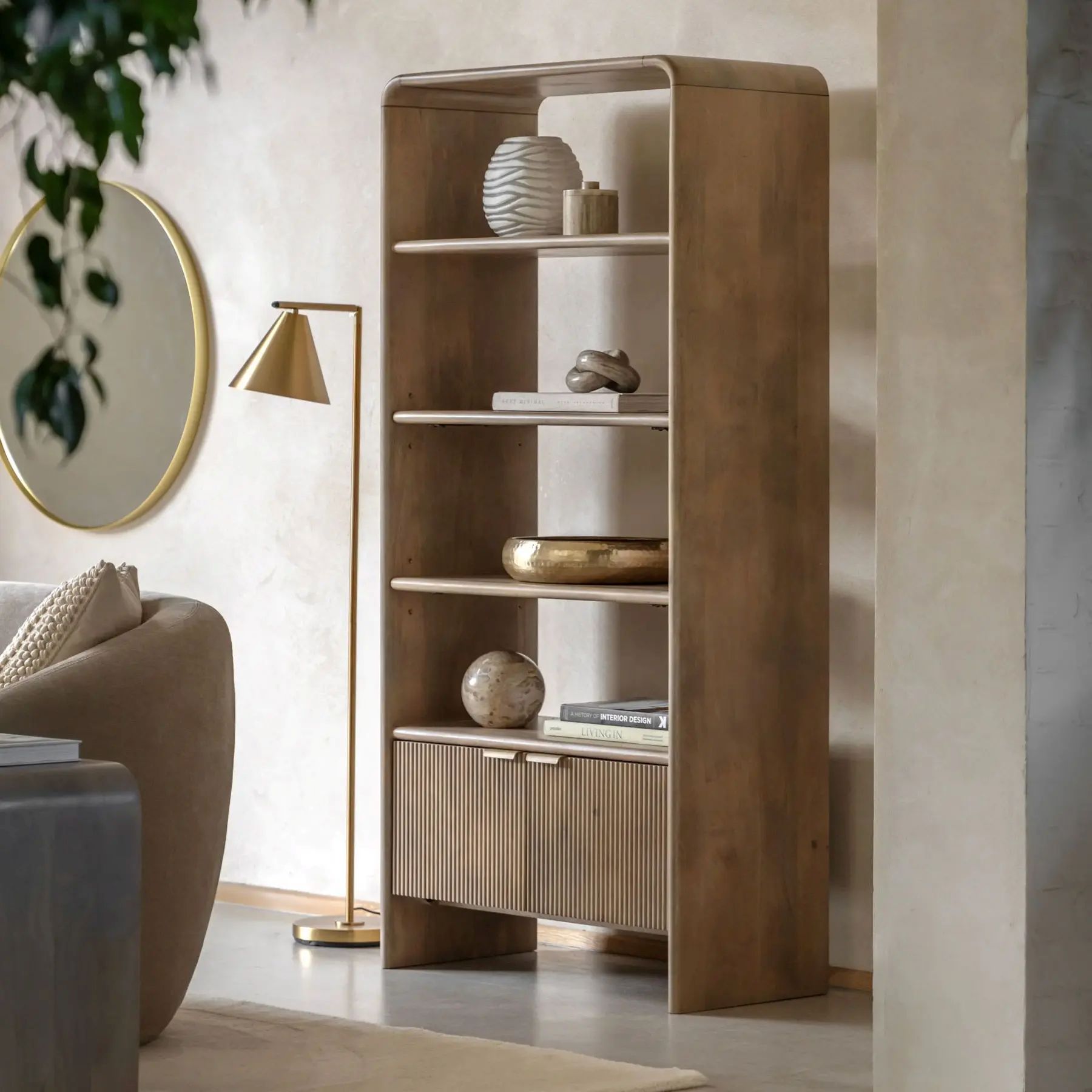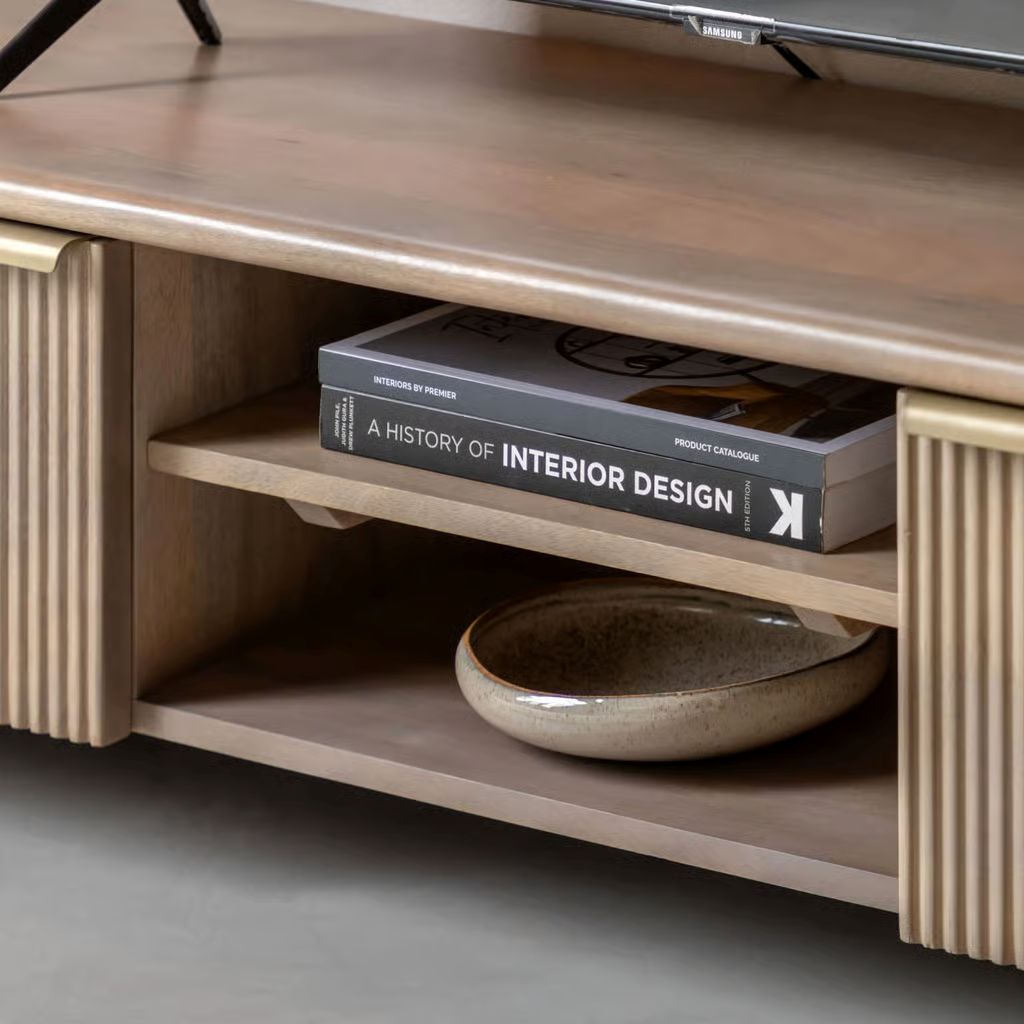 This media unit is a functional and stylish solution for media storage. With a curved top and fluted door detailing, it provides ample space for entertainment essentials. The sleek design fits effortlessly into modern living spaces, offering both organization and aesthetic appeal.
