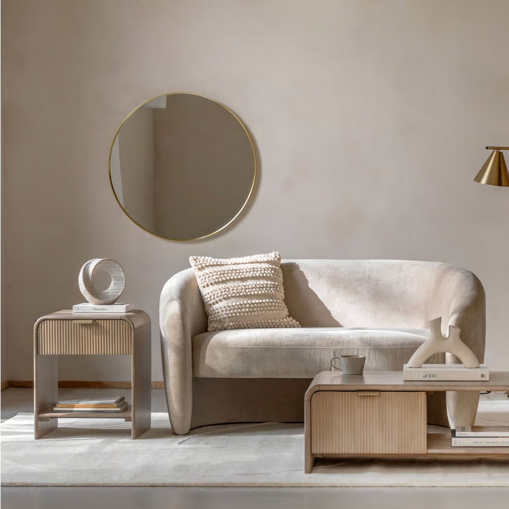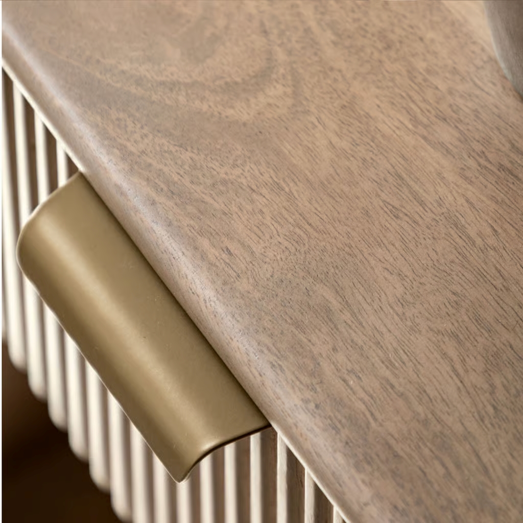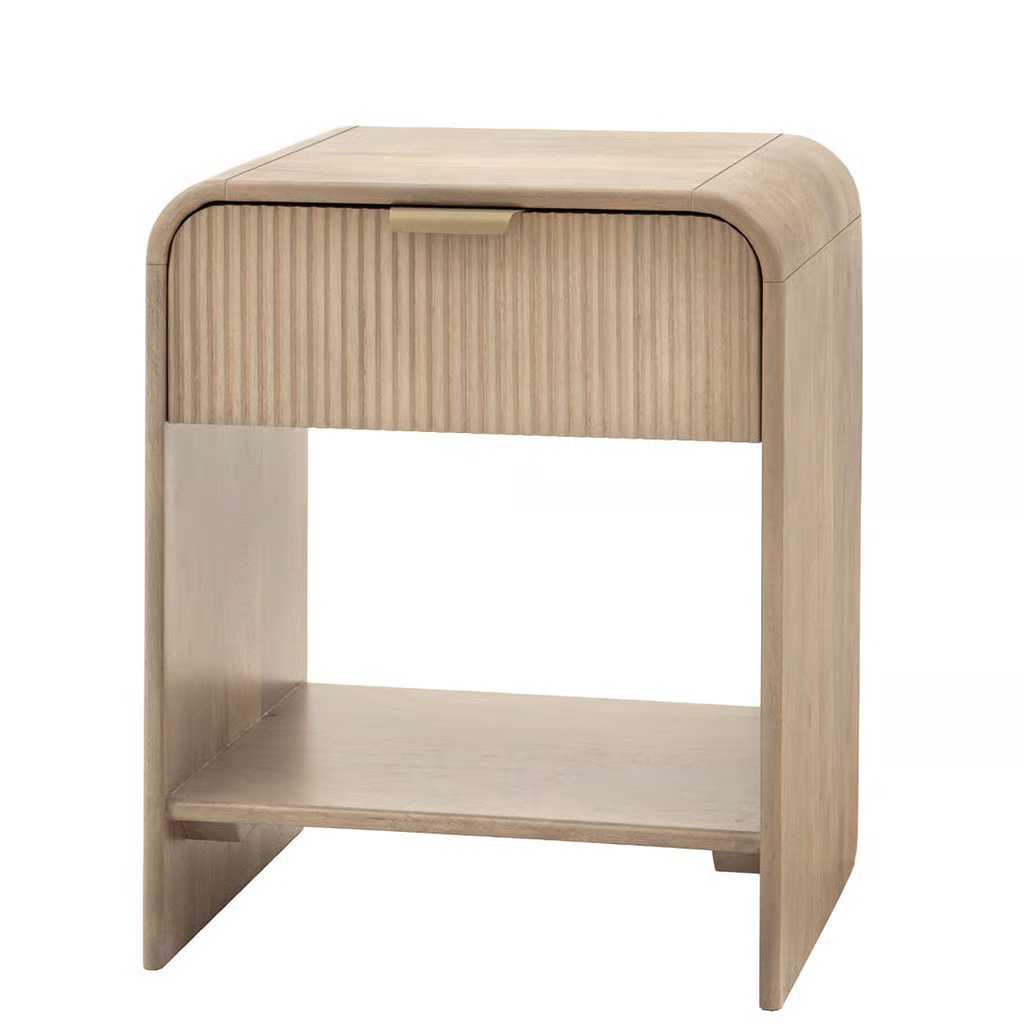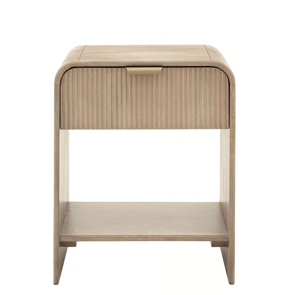 The sleek bedside table, with its curved design and fluted drawer, adds a touch of modern elegance to any bedroom. Crafted from high-quality wood, it offers both style and functionality. The spacious drawer and lower shelf provide ample storage for books, glasses, and other bedside essentials.