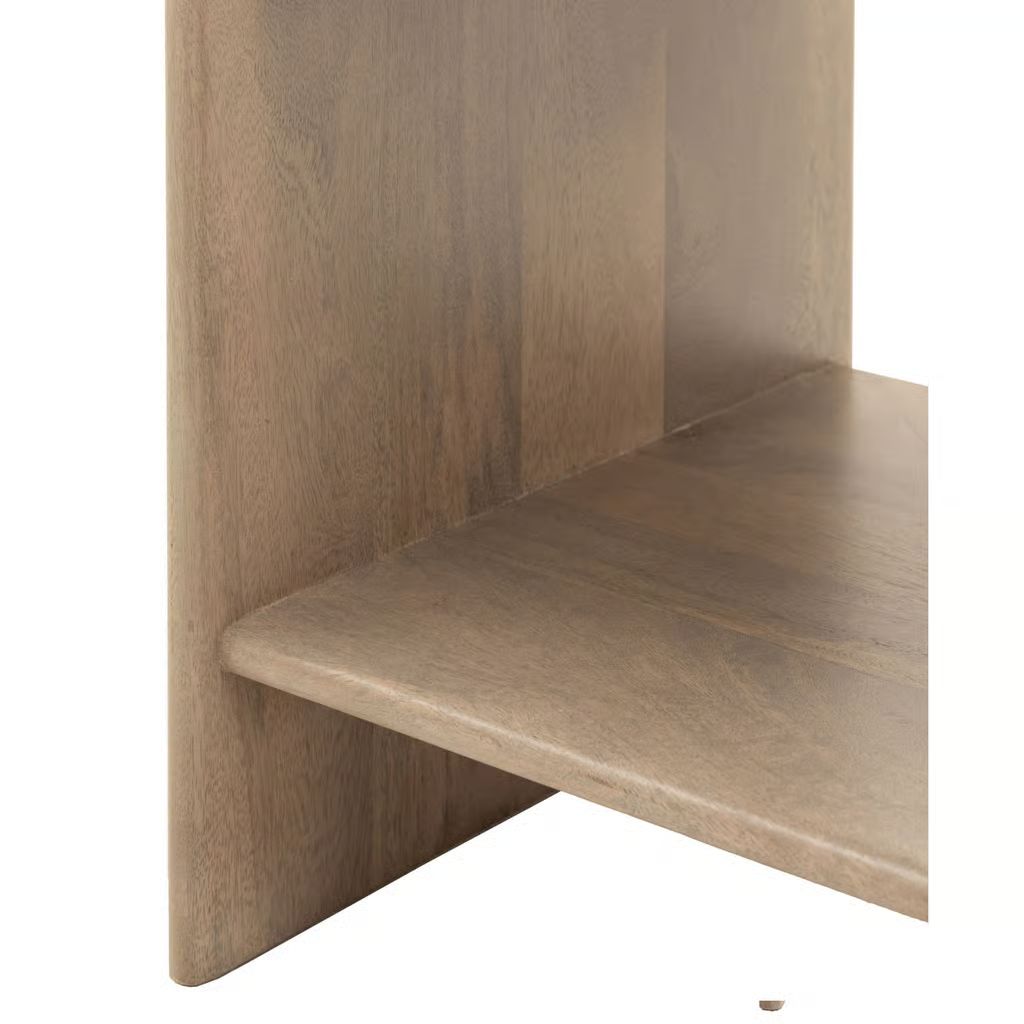 Colonna, stilrent og elegant sidebord/nattbord, med buet design og riflede skuf. Tilfører et snev av moderne eleganse til ethvert soverom eller stue. Laget av mangotre av høy kvalitet, tilbyr det både stil og funksjonalitet. Den romslige skuffen og den nedre hyllen gir rikelig med oppbevaringsplass for bøker, belysning og andre nødvendigheter.