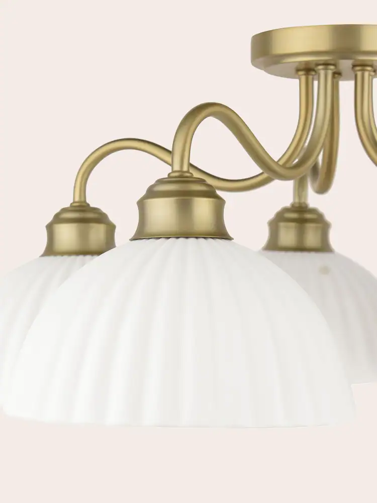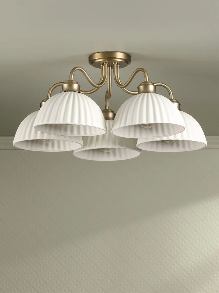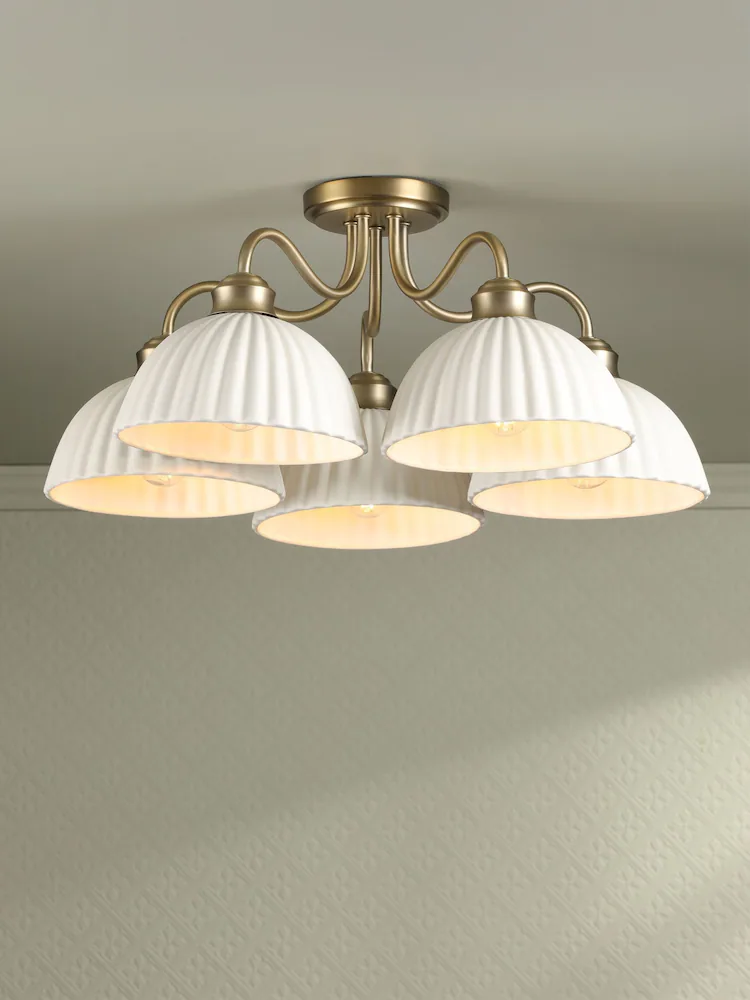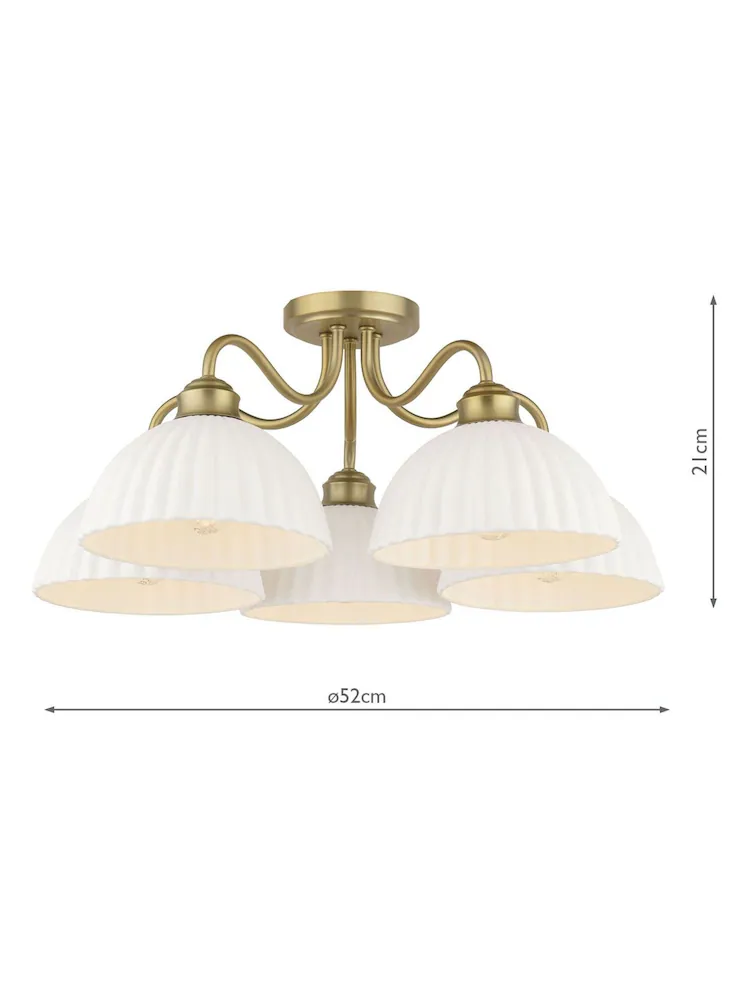 Elevate the style of any room with the Laura Ashley Durford 5 Light Semi Flush Ceiling Light. This timeless, vintage-inspired ceiling light features a matt antique brass finish that radiates warmth and sophistication. Paired with elegant porcelain shades, its semi-flush design makes it perfect for living rooms or bedrooms with lower ceilings