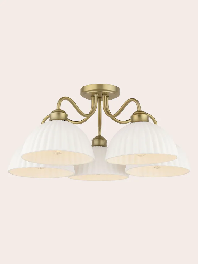 Durford fra Laura Ashley, en elegant og klassisk taklampe i antikk messing, med 5 porselensskjermer. Det stilrene og tidløse designet tilfører en subtil eleganse til rommet.