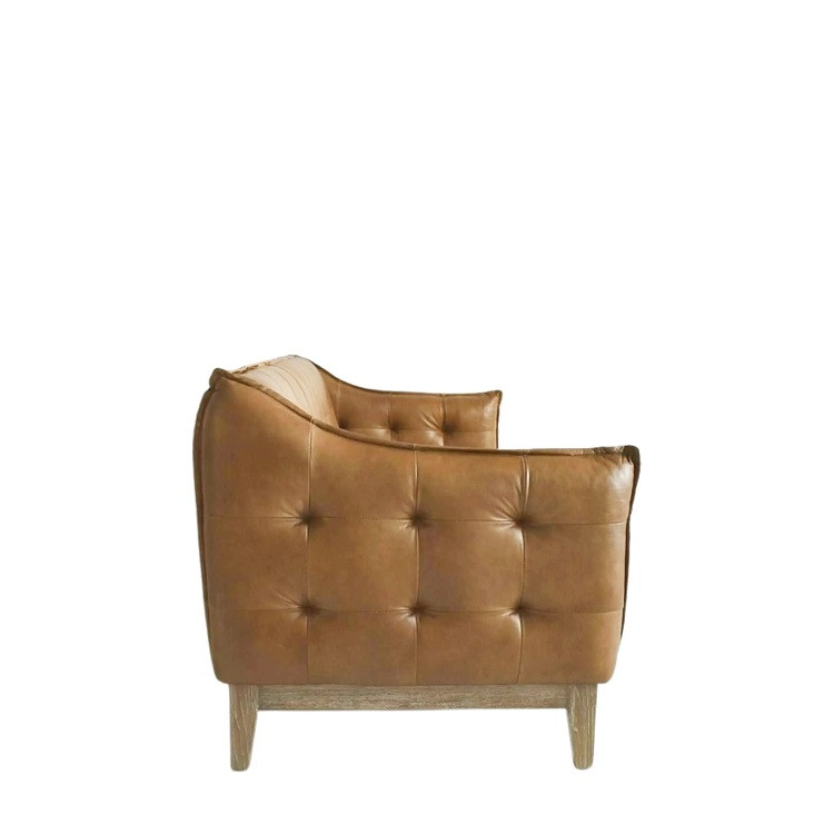 A stylish 3 seater sofa covered in top grain mellow brown vintage leather with solid ash legs and a decorative buttoned back.