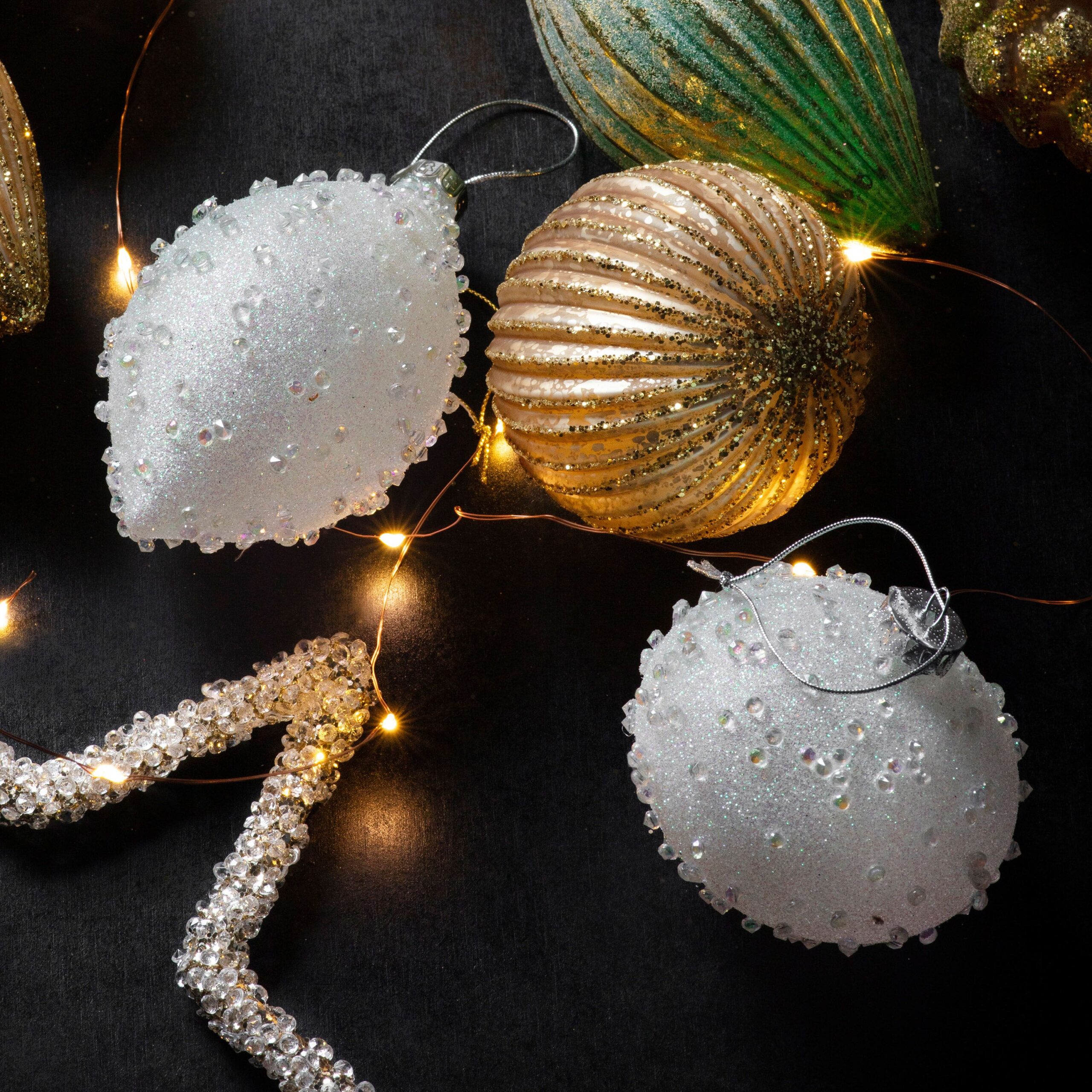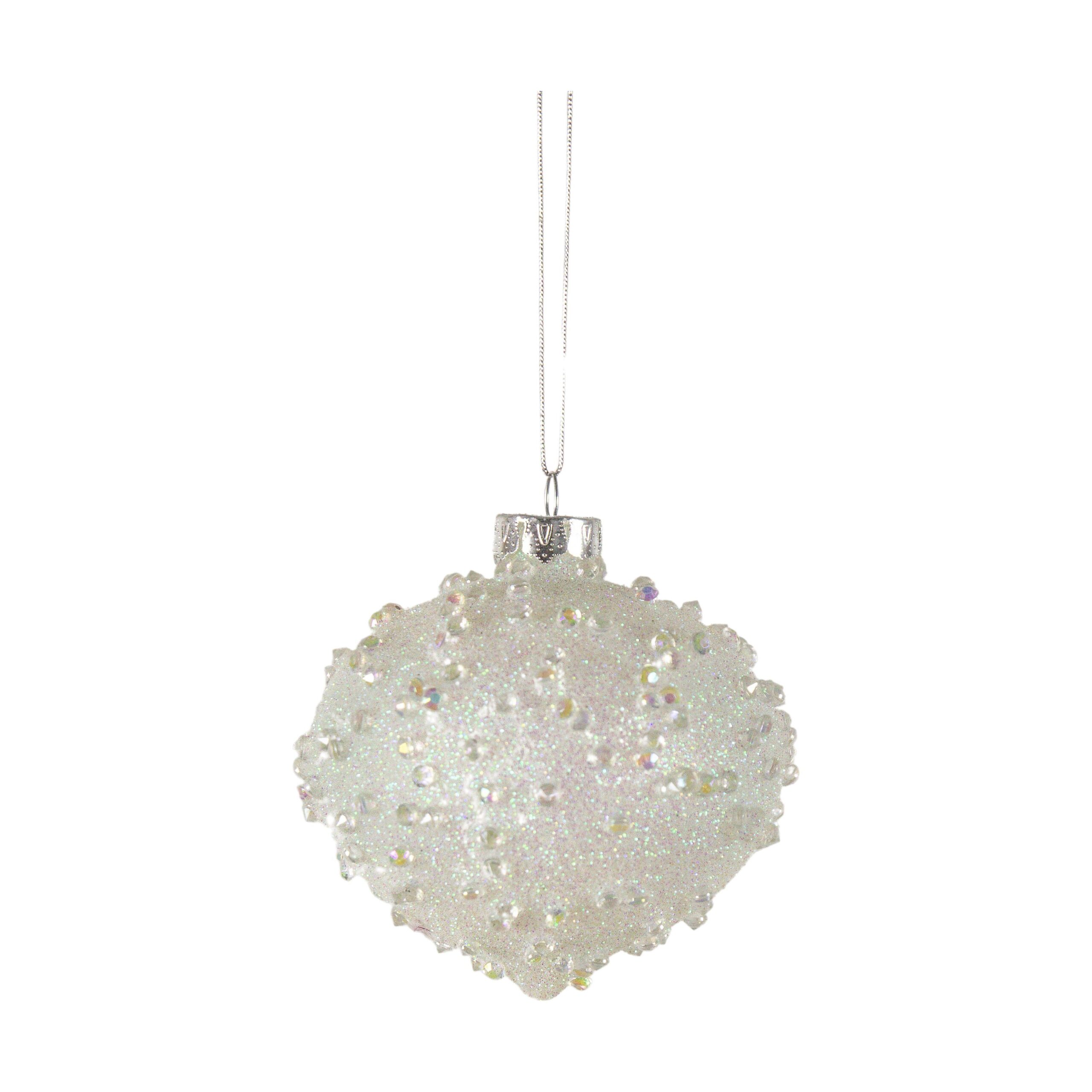 Elegant løkformet glitrende hvit julekule, kombiner gjerne med andre hvite kuler i glass. Et vakkert innslag til julehjemmet.