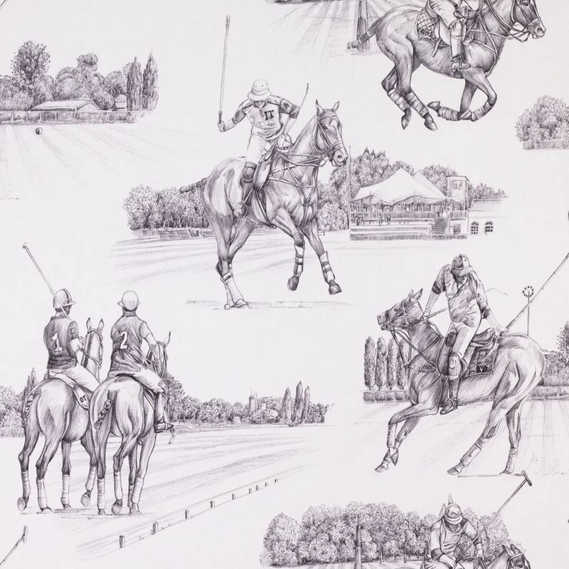 Estancia, en moderne Toile de Jouy med monokrome polohester og polospillere. Polospillet utfolder seg på dette gardin og møbelstoffet. For sporten- eller hesteelskeren.