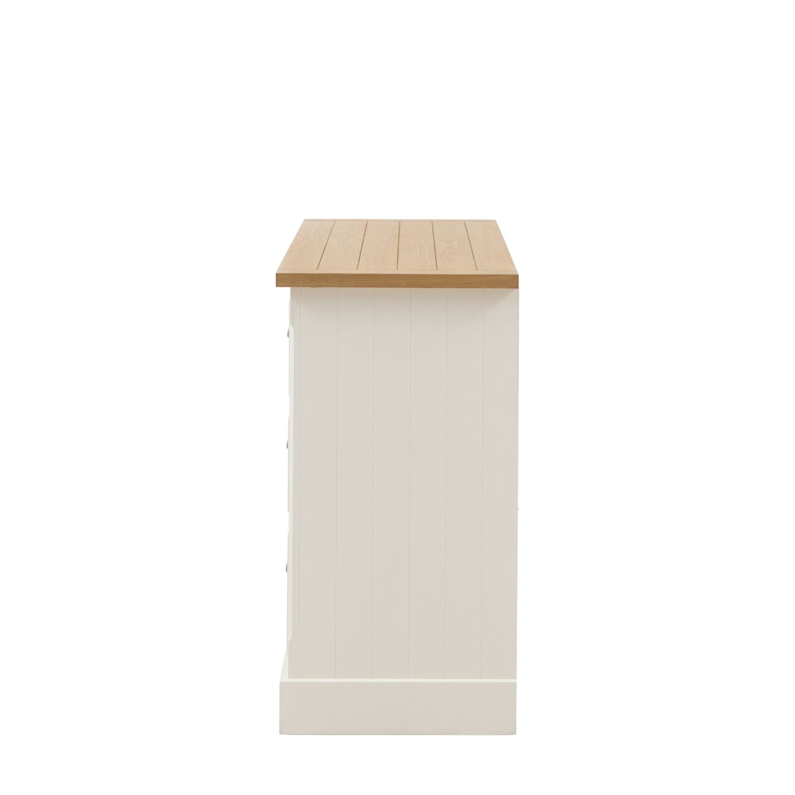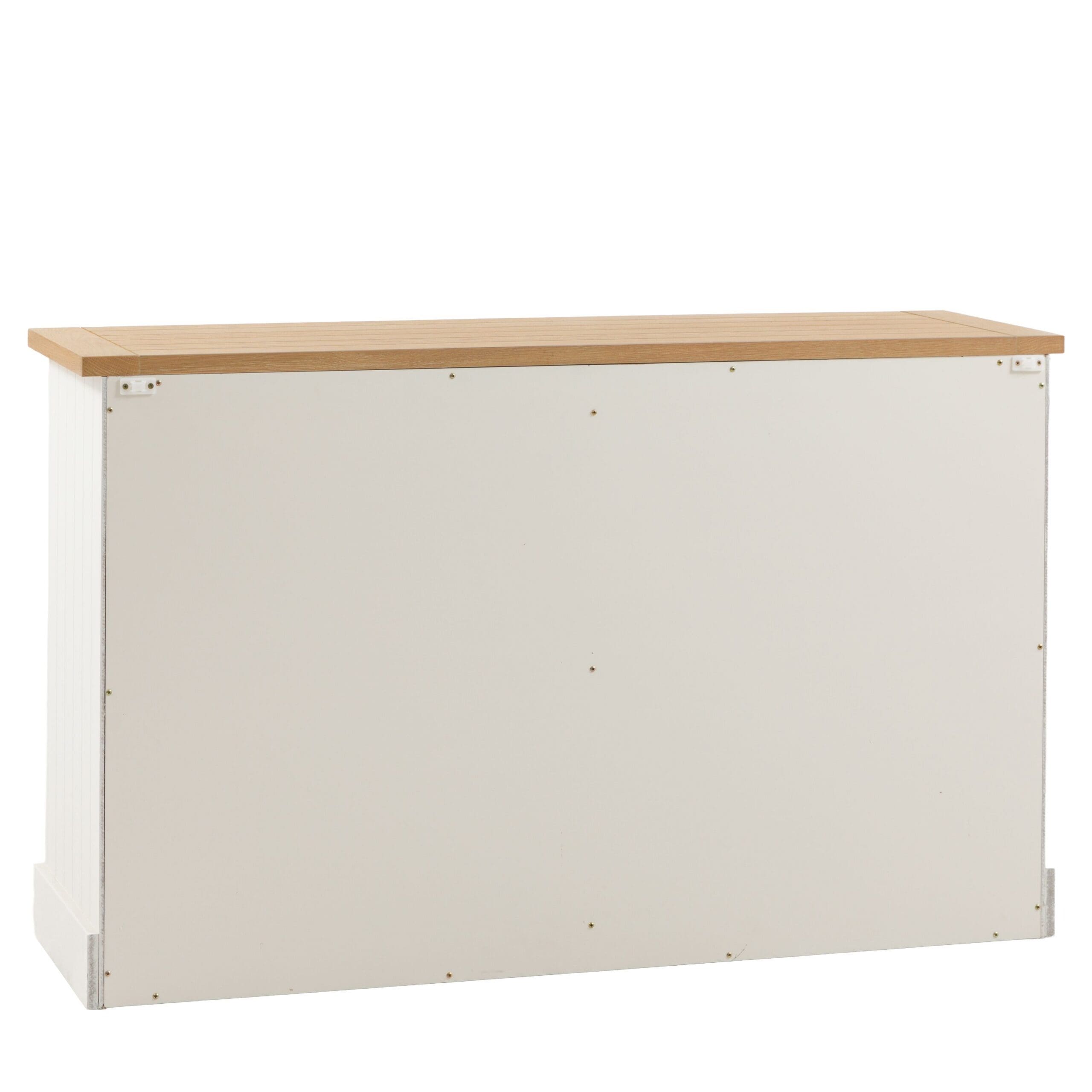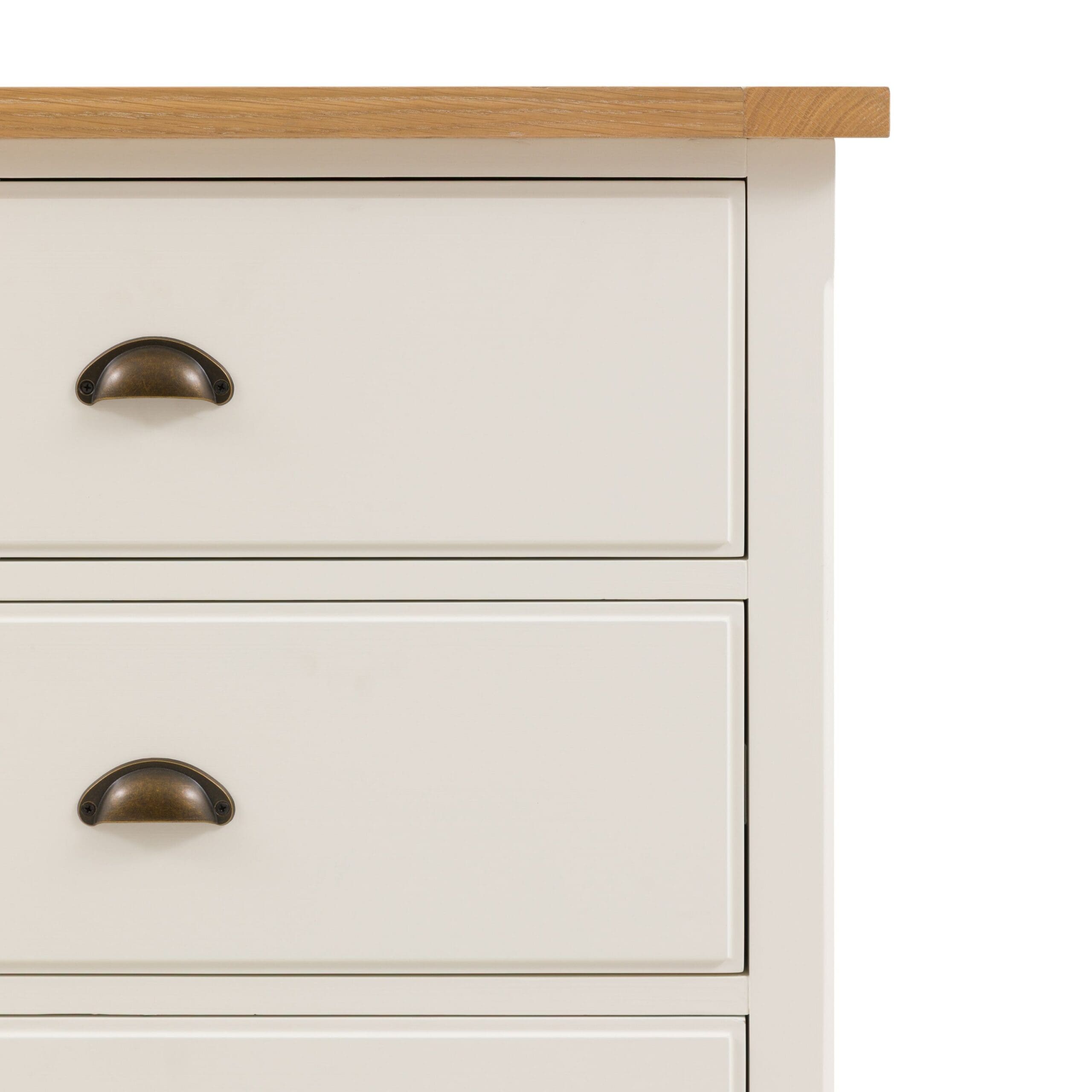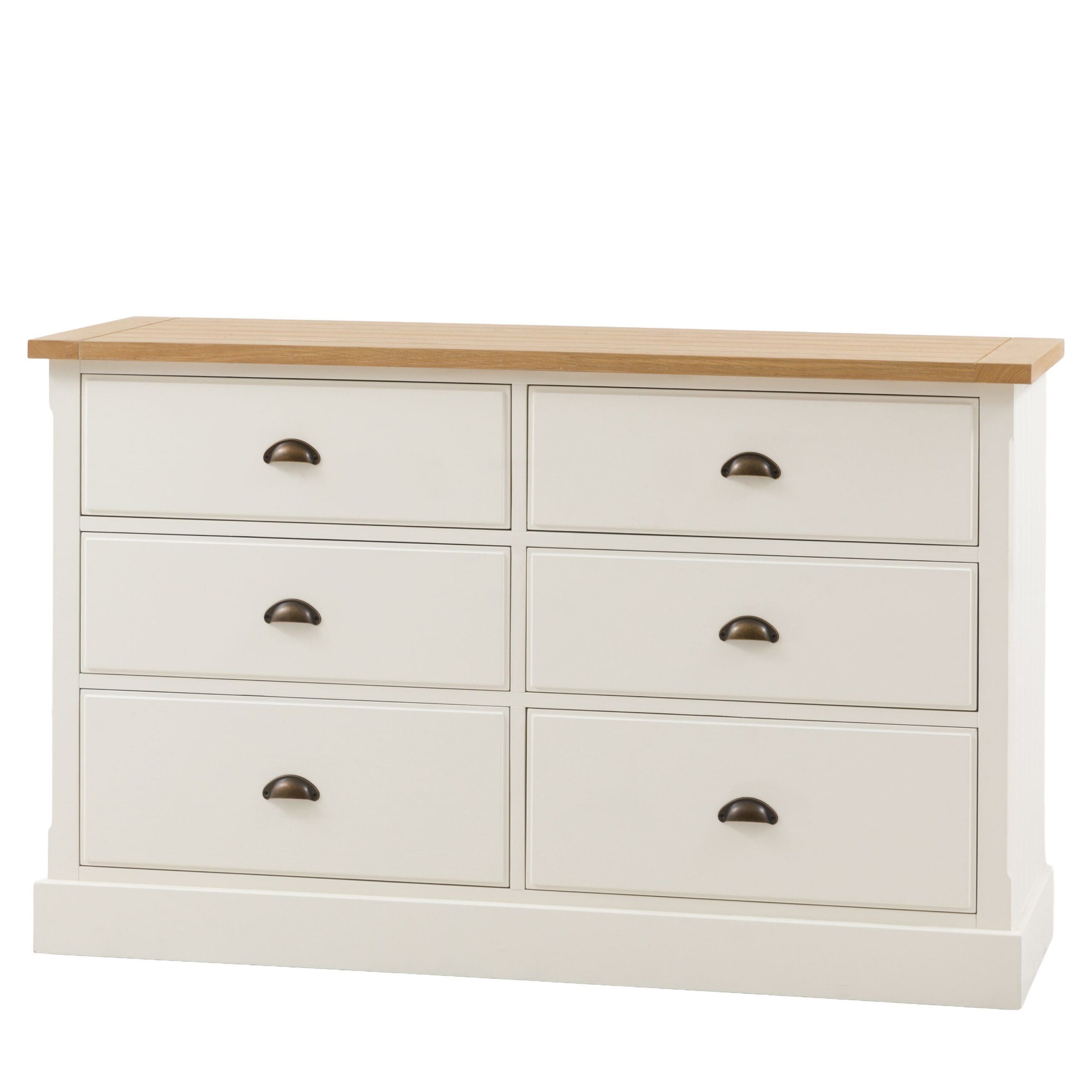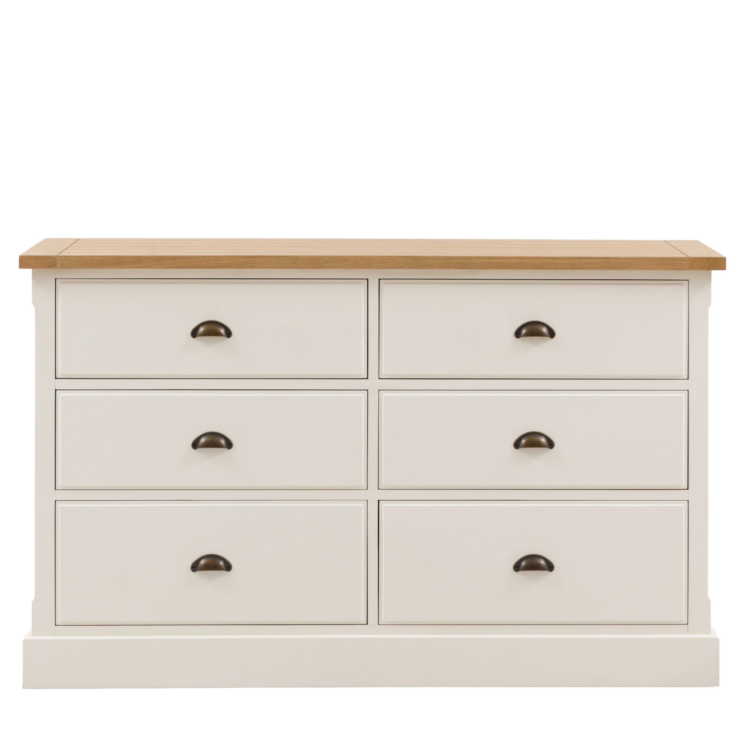 Tilfør praktisk oppbevaring og landlig sjarm til et soverom med denne kommoden med 6 skuffer. Den myke, hvitmalte finishen komplementerer den rillede, naturlige toppen i grummitre og eikefiner og metallhåndtaksdetaljene.