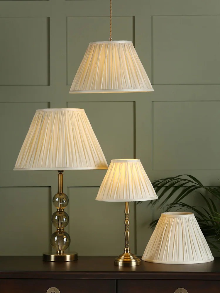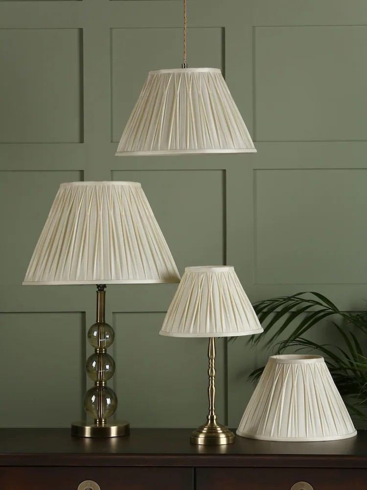 The Laura Ashley Fenn lightshade has a classic, angled form. Here it is finished in an elegant, pinched pleat smooth silk in Cream.