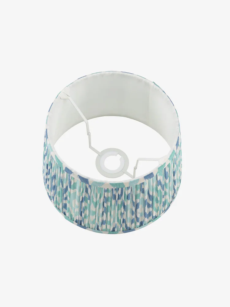 Folly, leken og lekker plissert lampeskjerm med ikatmønster i blått. En lampeskjerm som vil bringe farge og mønster til hjemmet. Kan benyttes til både bordlamper, og også som skjerm på pendel.