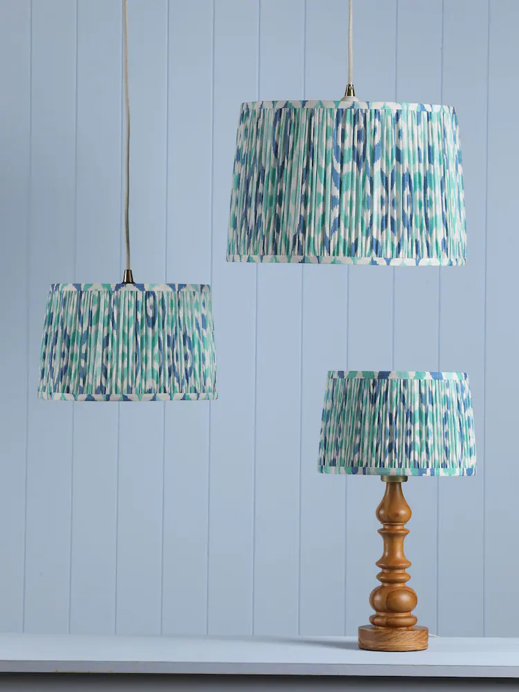 Folly, plissert lampeskjerm med ikatmønster i blått fra Joules