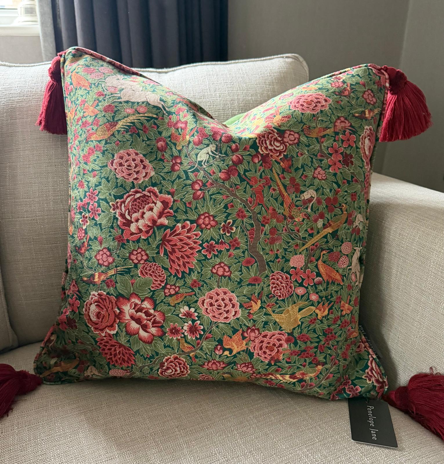 Forest Scene fra Art of the Loom sin Archives kolleksjon er et vakkert fløyelsstoff med skogsscener. Her i en vakker variant med skog og dyreliv i rødt og oker på en grønn fløyelsbunn. Stoffet har ull bakside, og er flammehemmende, med en martindale på 78 000 er det velegnet til møbler.