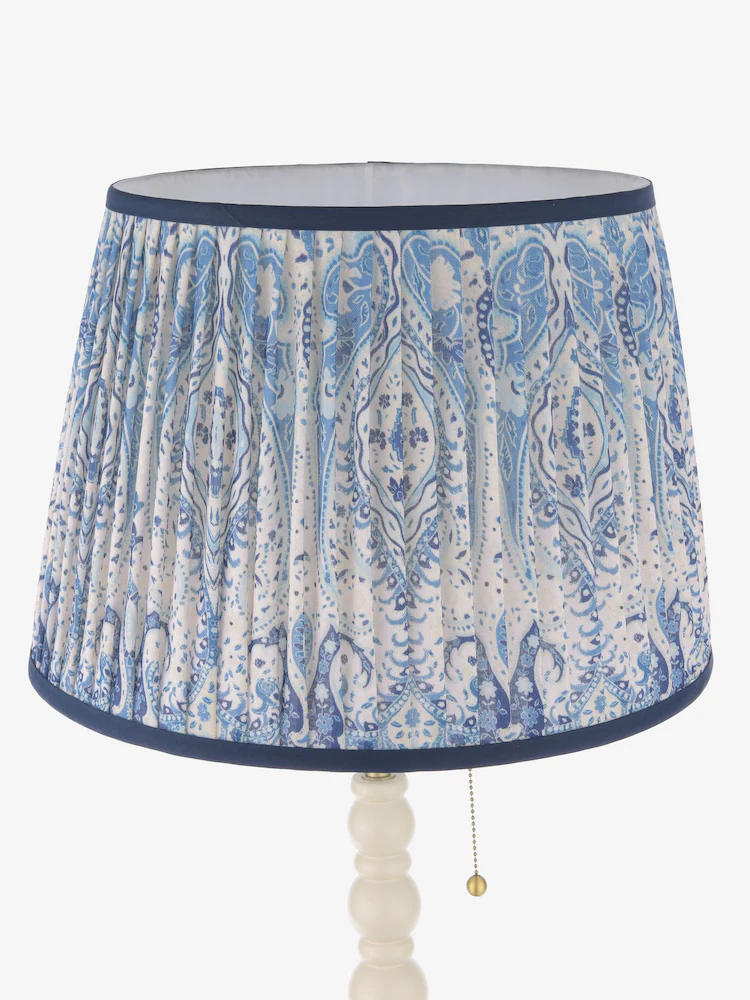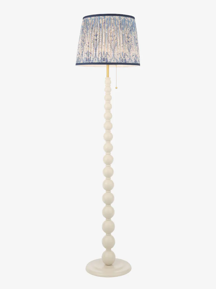 Harewood, stålampe med dreid trefot i krem og mønstrete blå skjerm fra Joules
