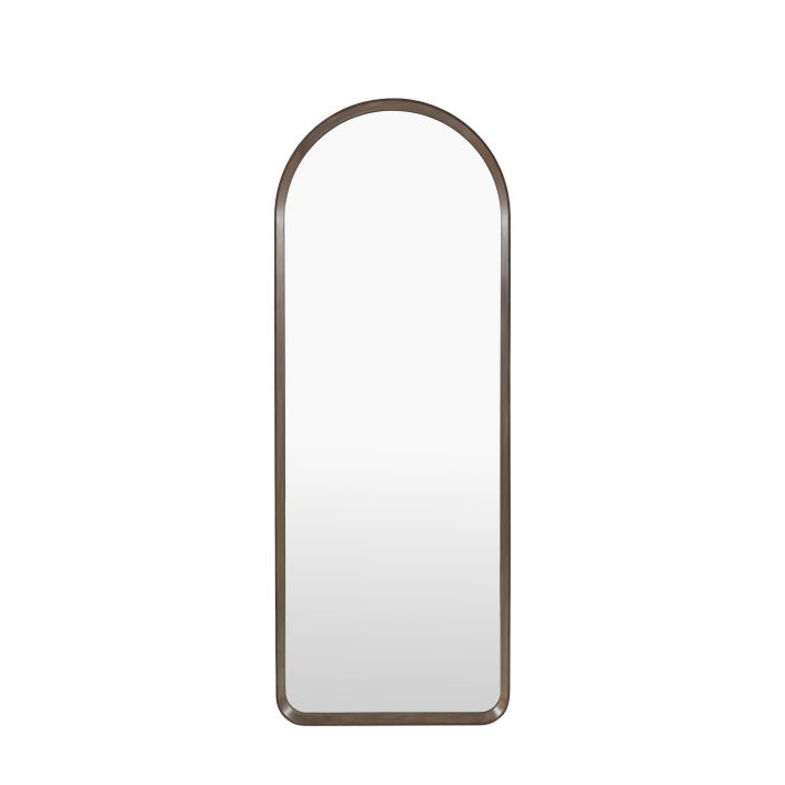 Dette skandinavisk-inspirerte buede gulvspeilet er moderne, enkelt og raffinert. Designet for å gi diskré eleganse og en frisk følelse til moderne interiør. Speilet er laget av valnøttbeiset eik som fremhever den vakre naturlige årringene.