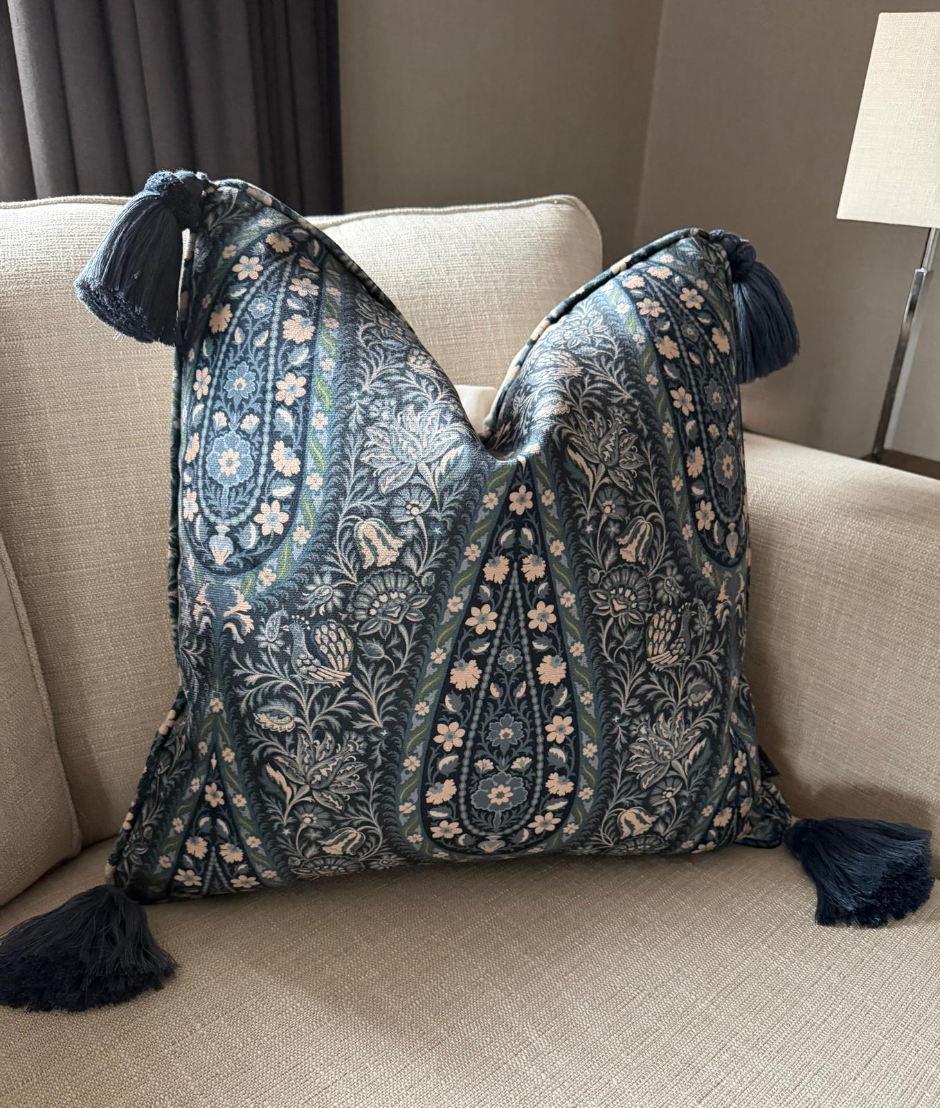 Jaipur Deep, putetrekk i paisleymønstrete blå fløyel, med dusker