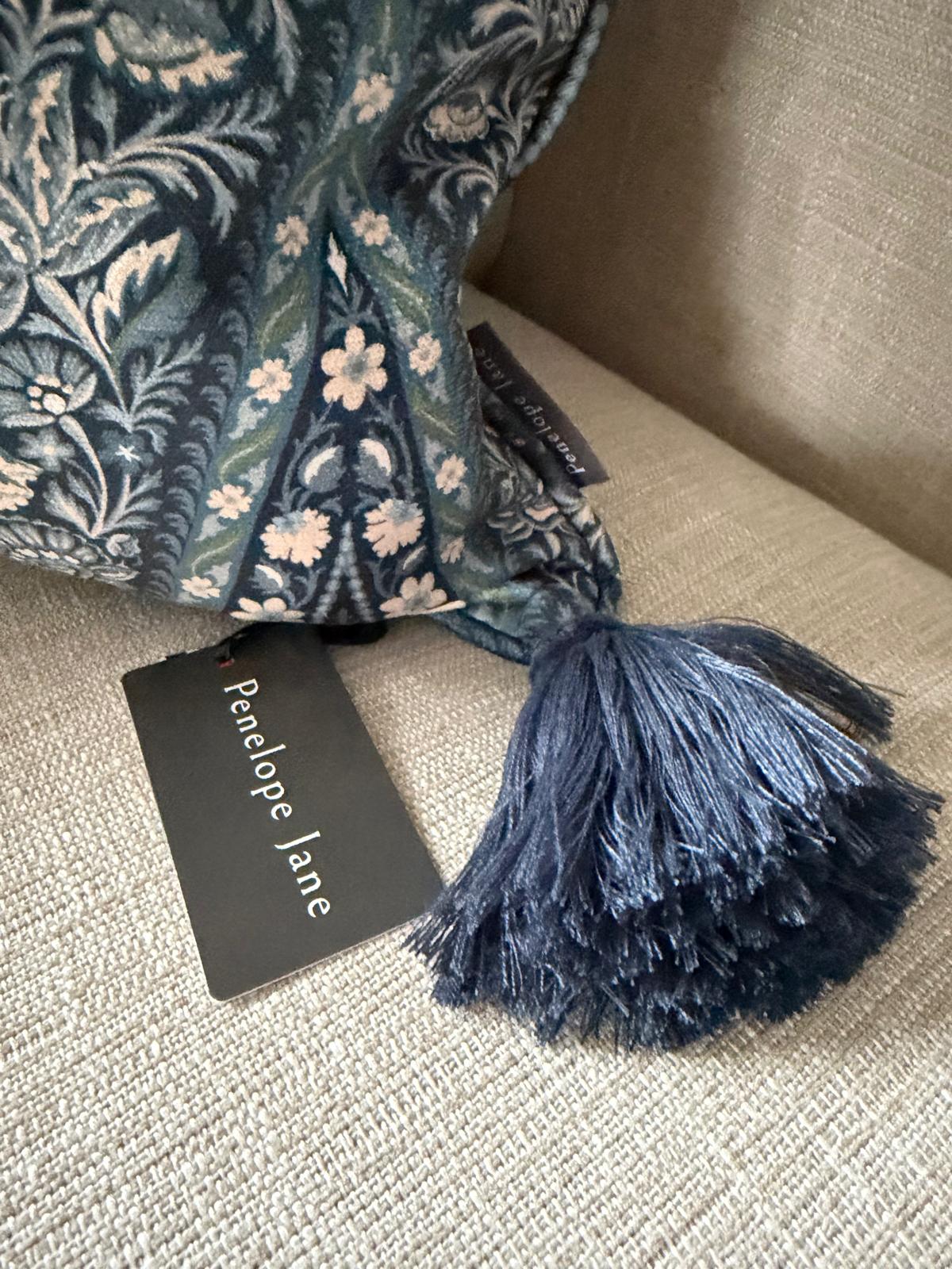 Jaipur,  a beautiful classic, paisley patterned fabric from Art of the Loom. Here in a cushion designed and produced by Art of Home and Penelope Jane. The lovely pattern in blues, in combination with blue tassels, gives it an exclusive and luxurious feel.