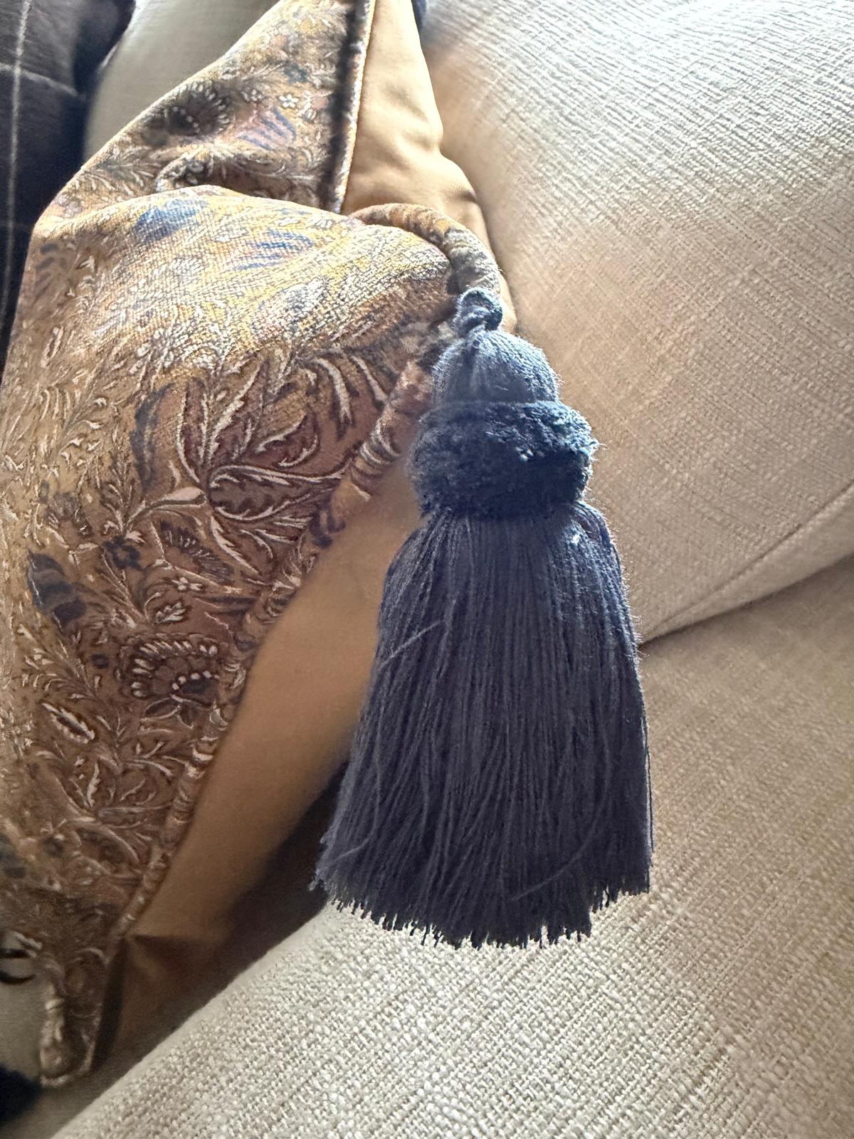 Jaipur FLoral,  a beautiful classic, floral patterned fabric from Art of the Loom. Here in a cushion designed and produced by Art of Home and Penelope Jane. The lovely pattern in gold and blues, in combination with Blue tassels, gives it an exclusive and luxurious feel.