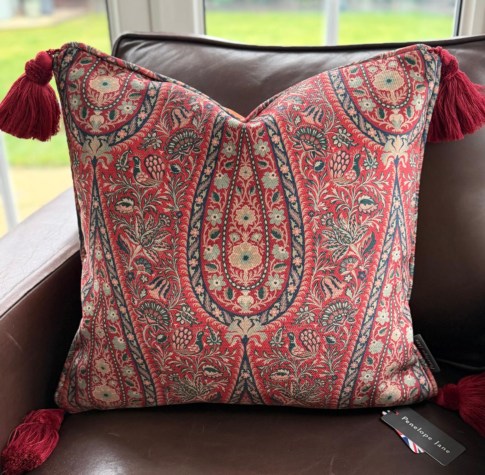 Jaipur fra Art of the Loom sin Archives kolleksjon, et vakkert fløyelsstoff med paisleymønster. Her i en klassisk fargekombinasjon i rødt. Stoffet har ull bakside, og er flammehemmende, med en martindale på 78 000 er det velegnet til møbler.