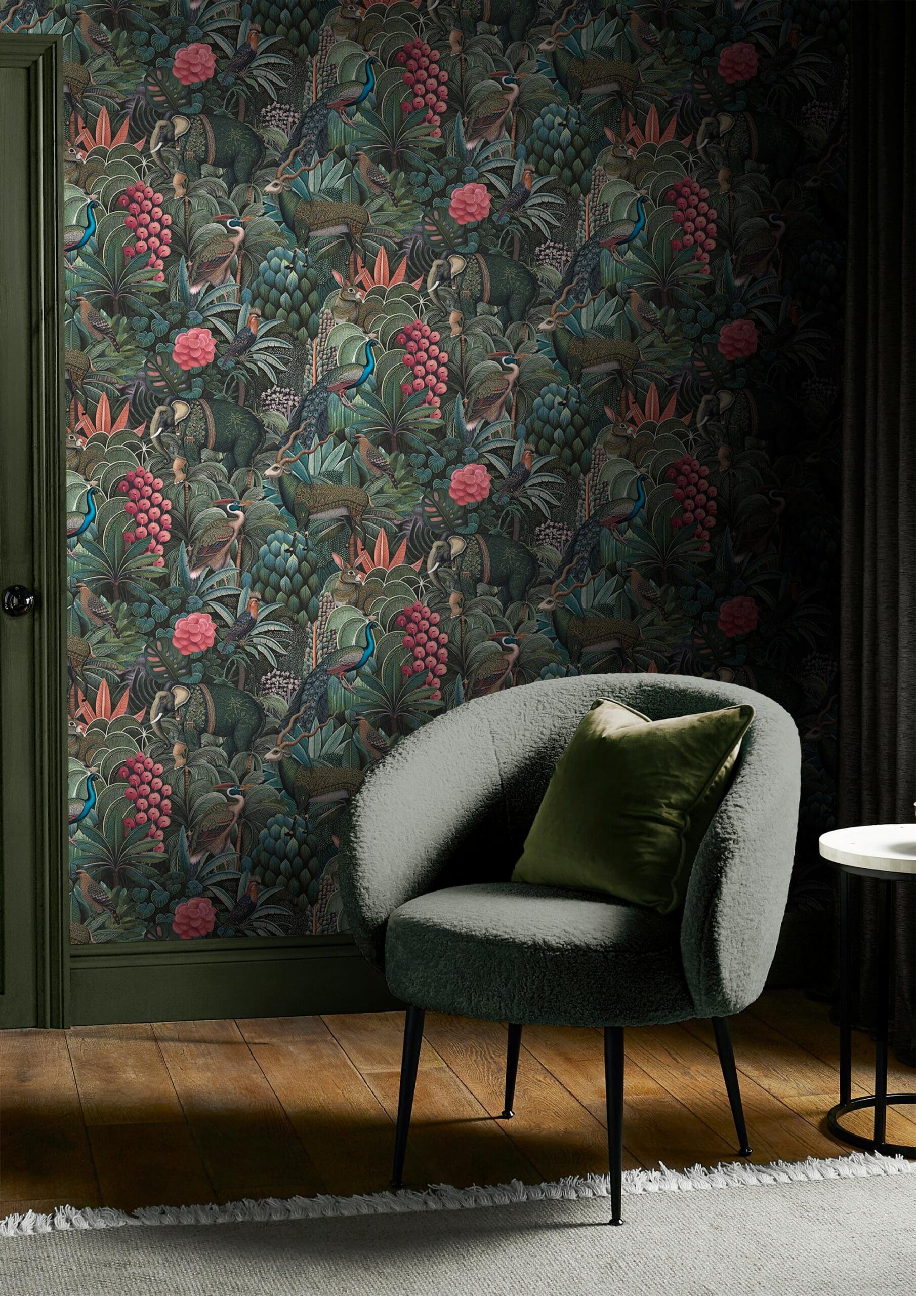 Jungle Jamboree, dyrisk tapet i grønt. Dyre- og fuglelivet i denne tapeten skaper liv i rommet. De dype rike fargetonene i grønne nyanser gir et voksent og sobert lekent uttrykk.