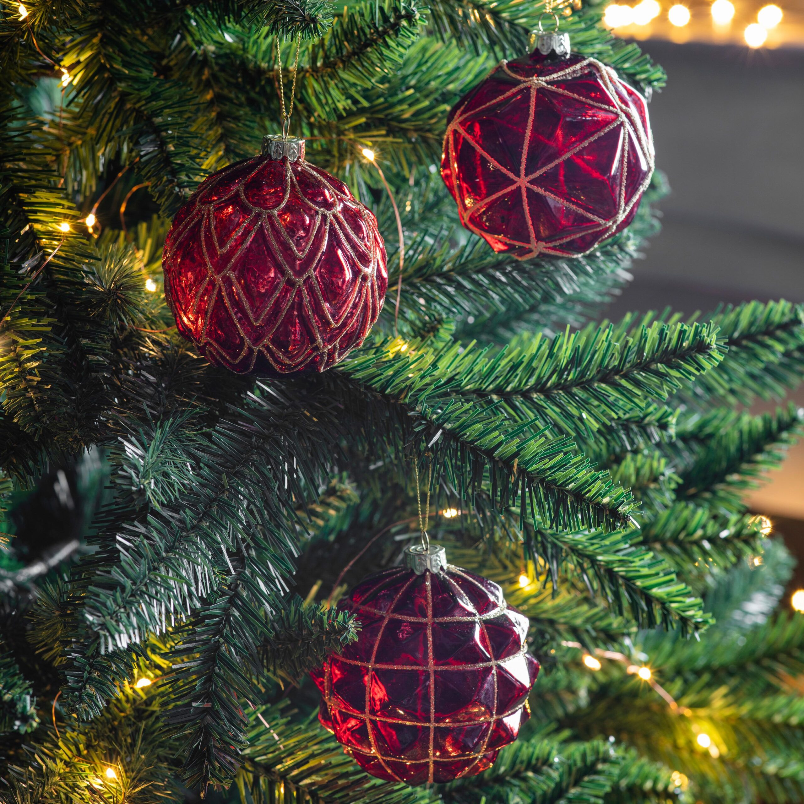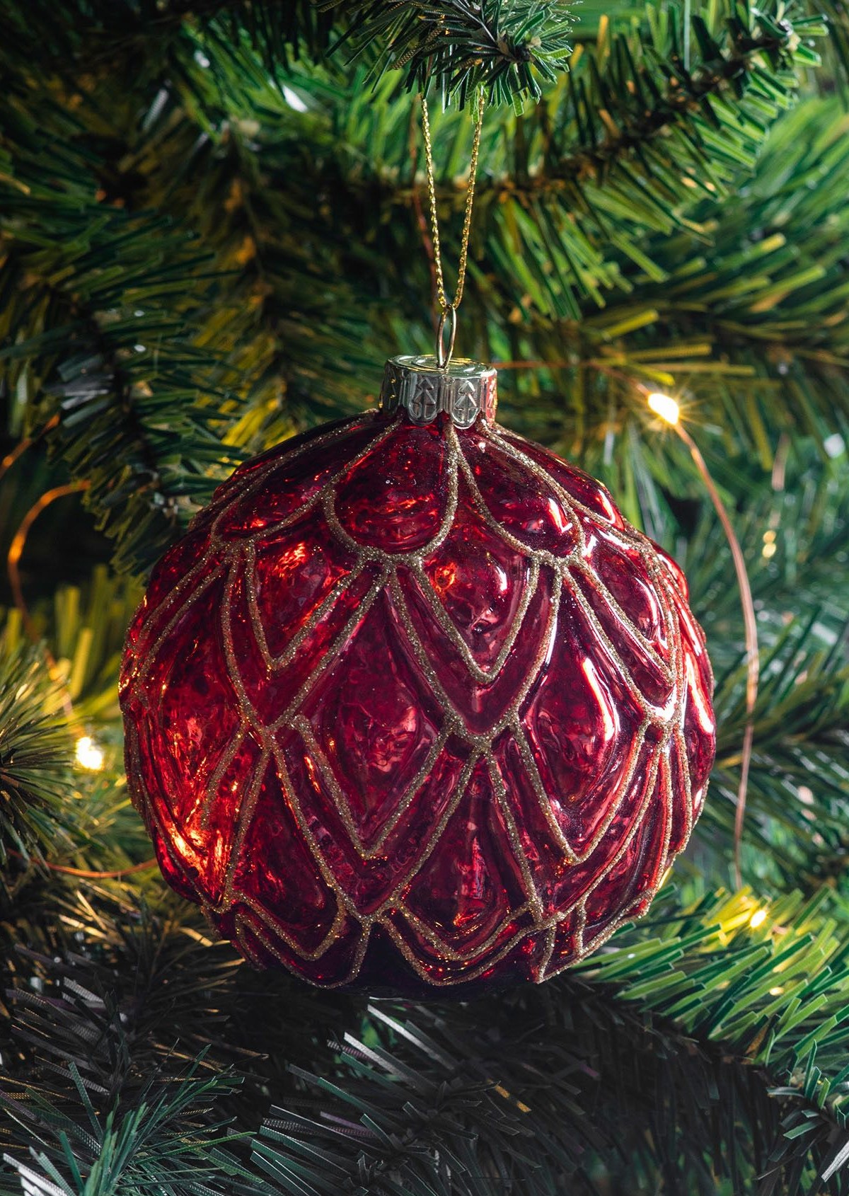 The Ruby Geo Pattern Bauble are perfect for adding a bright, cheerful touch to a Christmas tree. In a lovely deep red, with delicate gold lines highlighting the design.