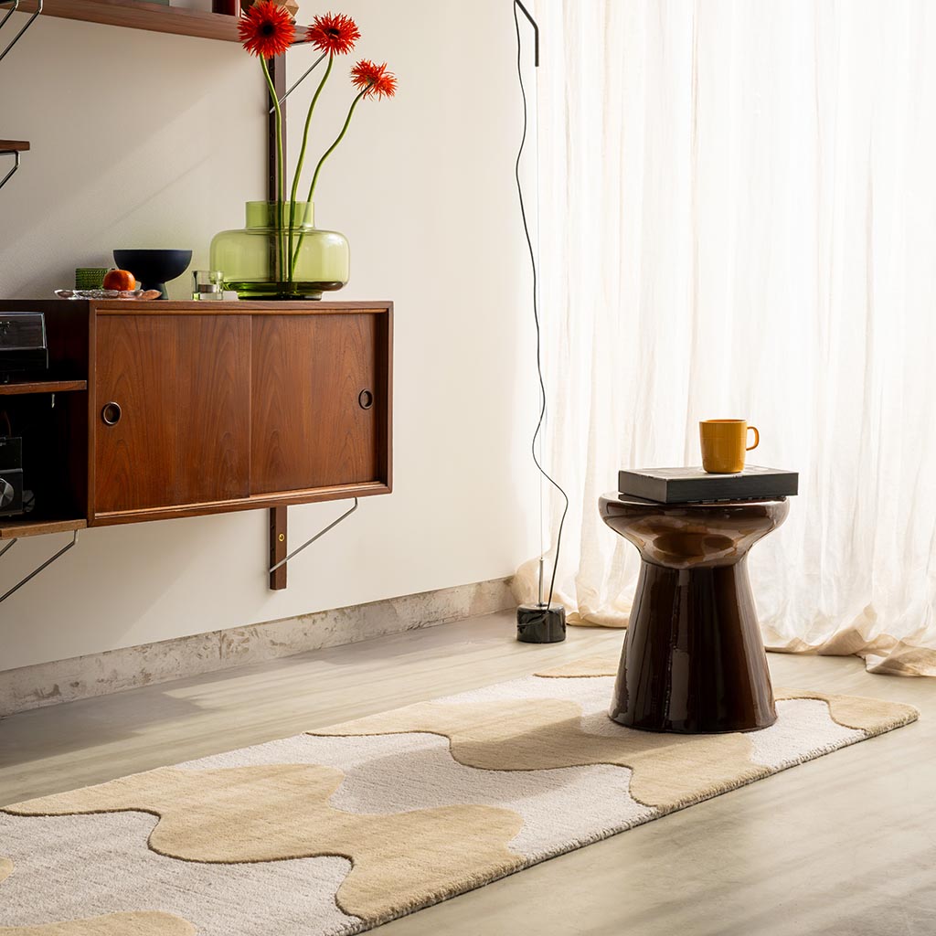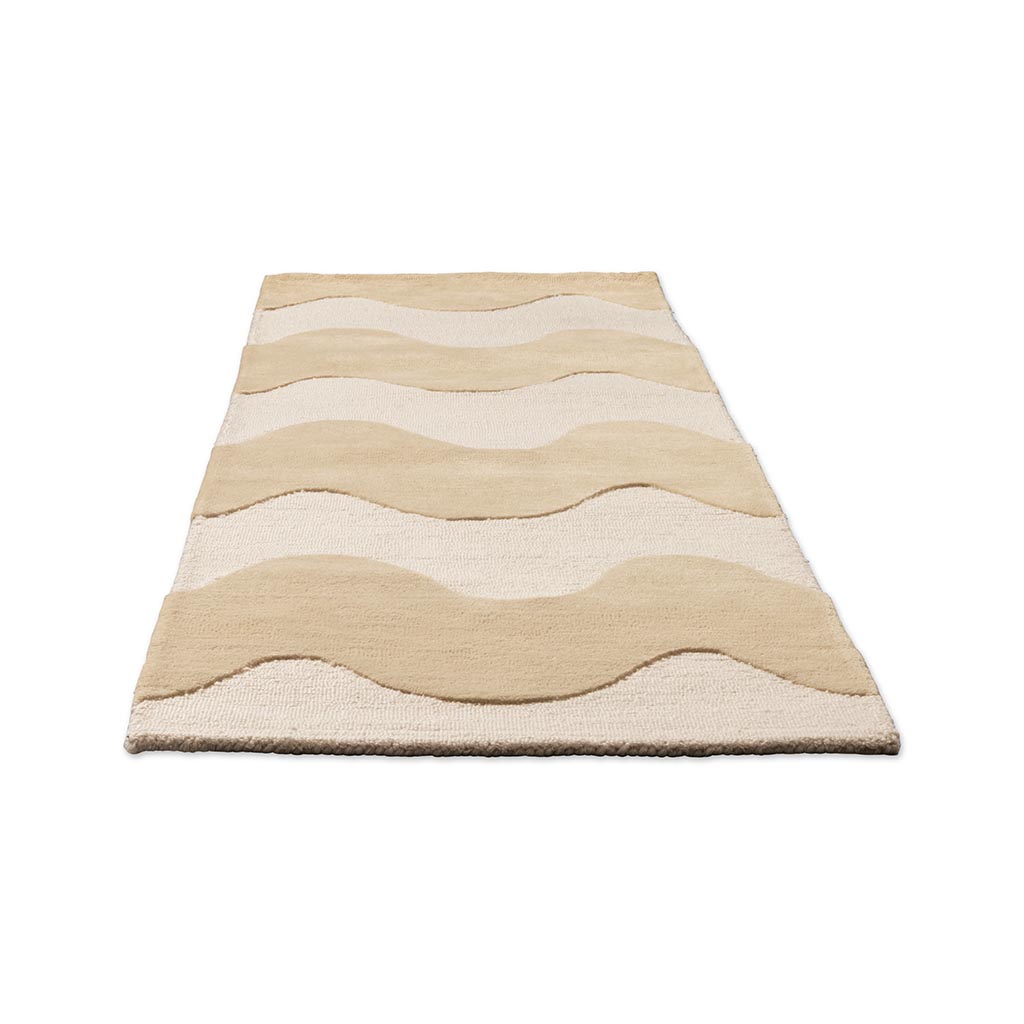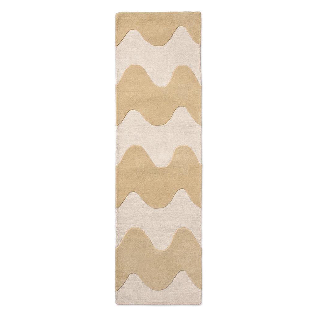 Lokki, inspirert av en gardins bølger i vinden. Bølgemønsteret har en tidløs og beroligende følelse, her som en gulvløper i gyllent beige og naturhvit.