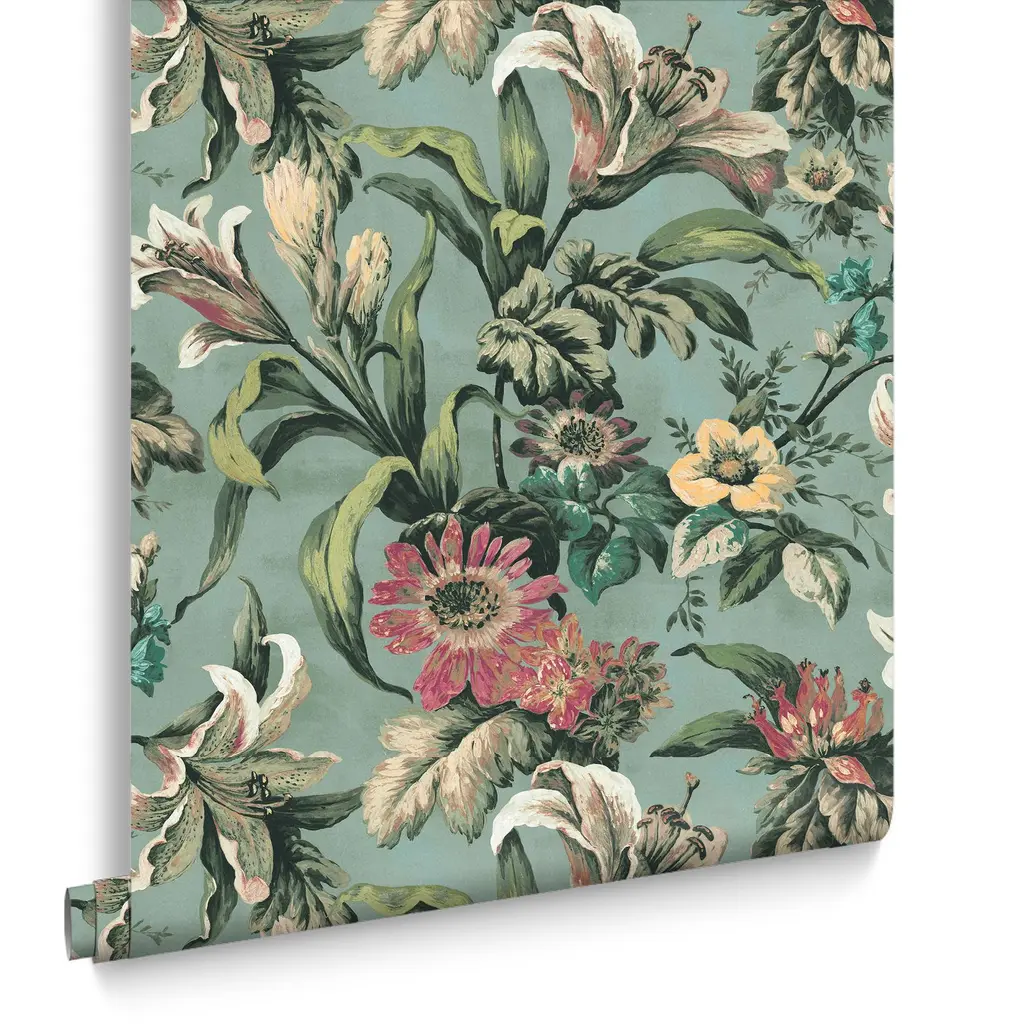 The seaspray blue backdrop enhances the delicate lilies, creating a harmonious and inviting atmosphere. The lilies in this design add a sense of tranquillity and elegance to any room.