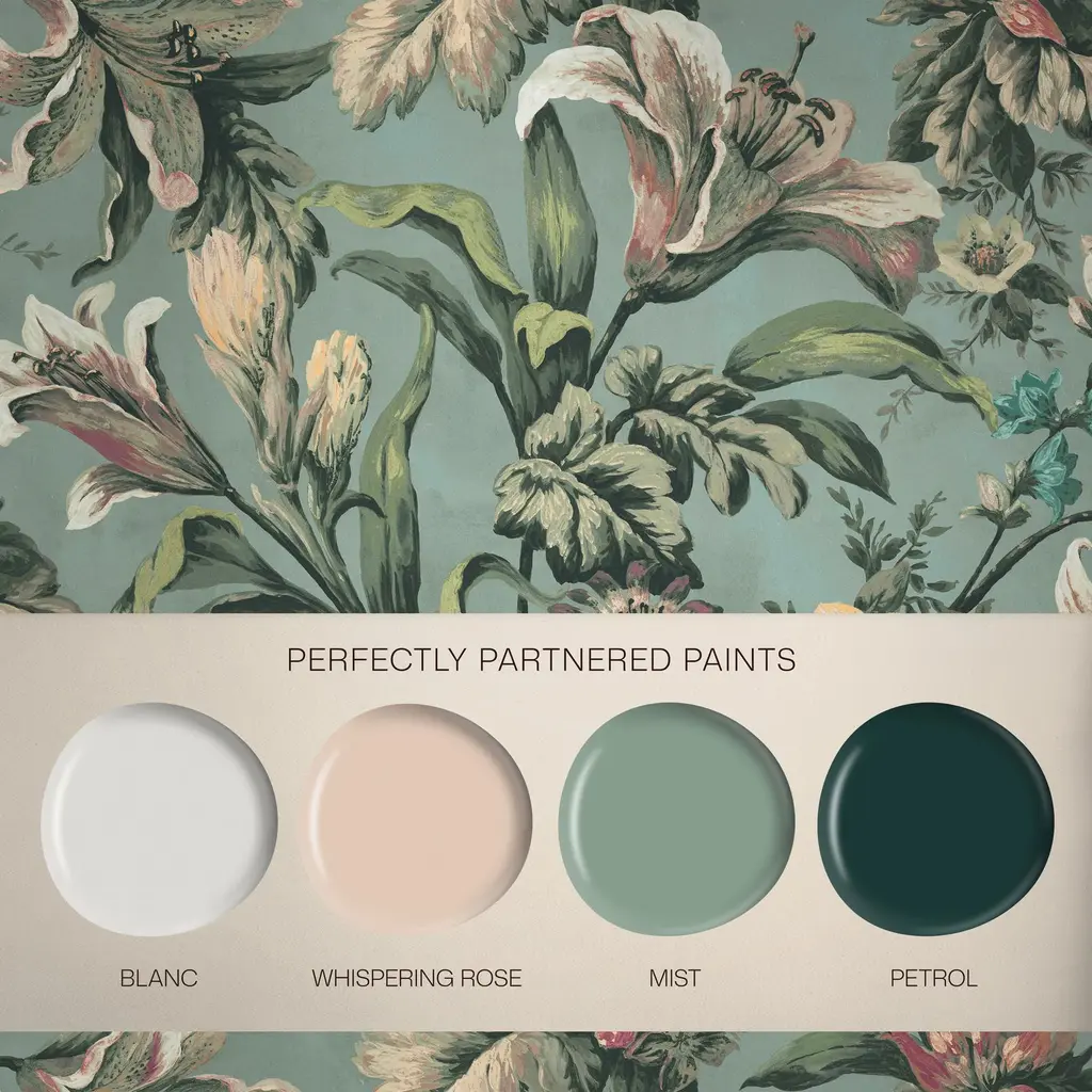 Forvandle rommet, med den tidløse skjønnheten: Lys Mist tapet. Håndmalte liljer og blomster, kombinerer dette tapetet naturens eleganse med kunstnerisk raffinement.