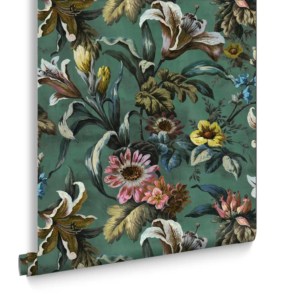 Lys Petrol, storblomstrete tapet med liljer i blågrønt