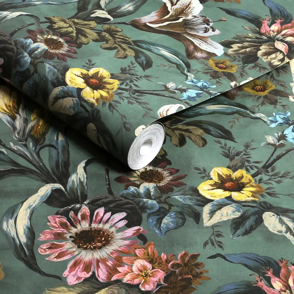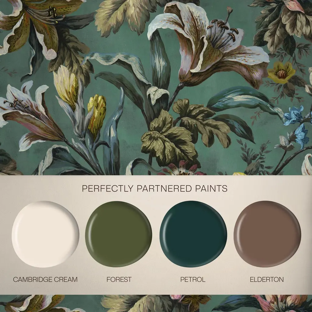 Forvandle rommet ditt med den tidløse skjønnheten til Lys Petrol tapet. Håndmalte liljer og livlige blomster, kombinerer dette tapetet naturens eleganse med kunstnerisk raffinement.