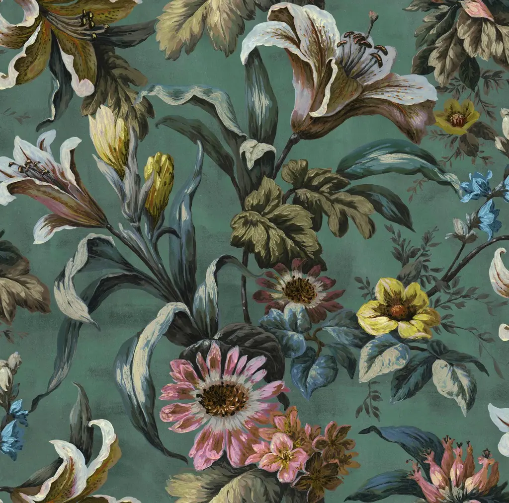 Forvandle rommet, med den tidløse skjønnheten: Lys Petrol tapet. Håndmalte liljer og blomster, kombinerer dette tapetet naturens eleganse med kunstnerisk raffinement.