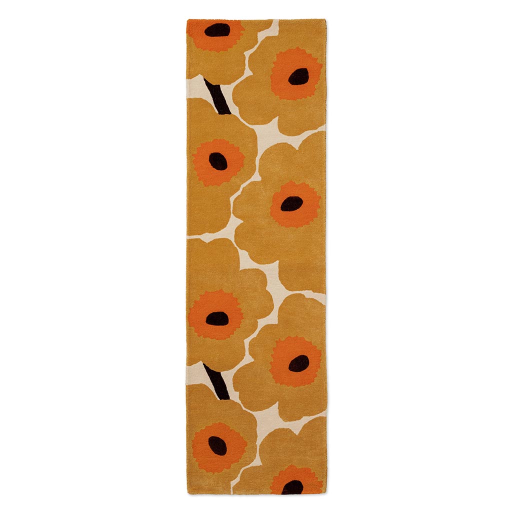 Marimekko sin verdenskjente designsignatur kommer til syne her i denne gulvløperen i gul ull. Unikko som er et av de mest velkjente designene gjør denne løperen til et spennende tilskudd til hjemmet.