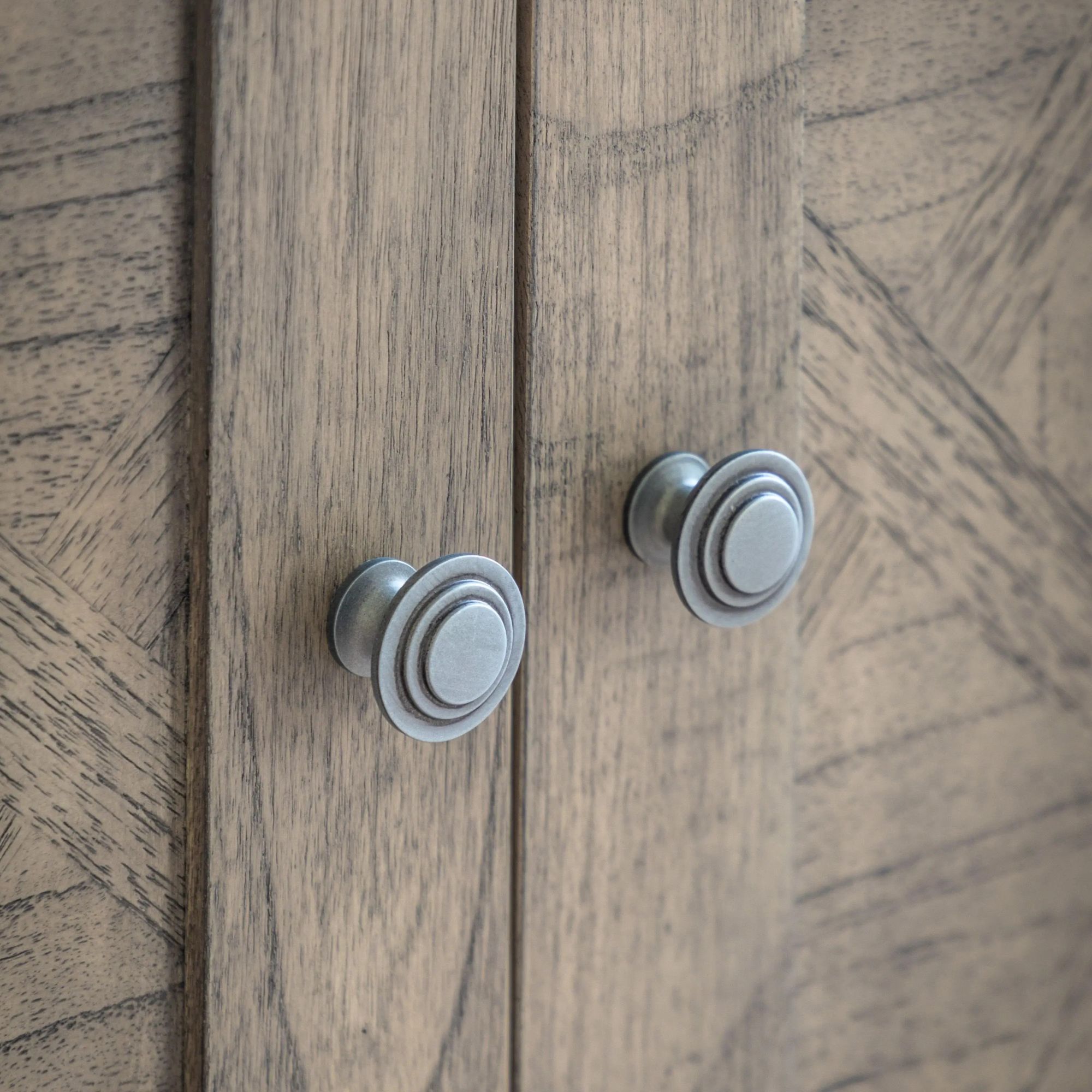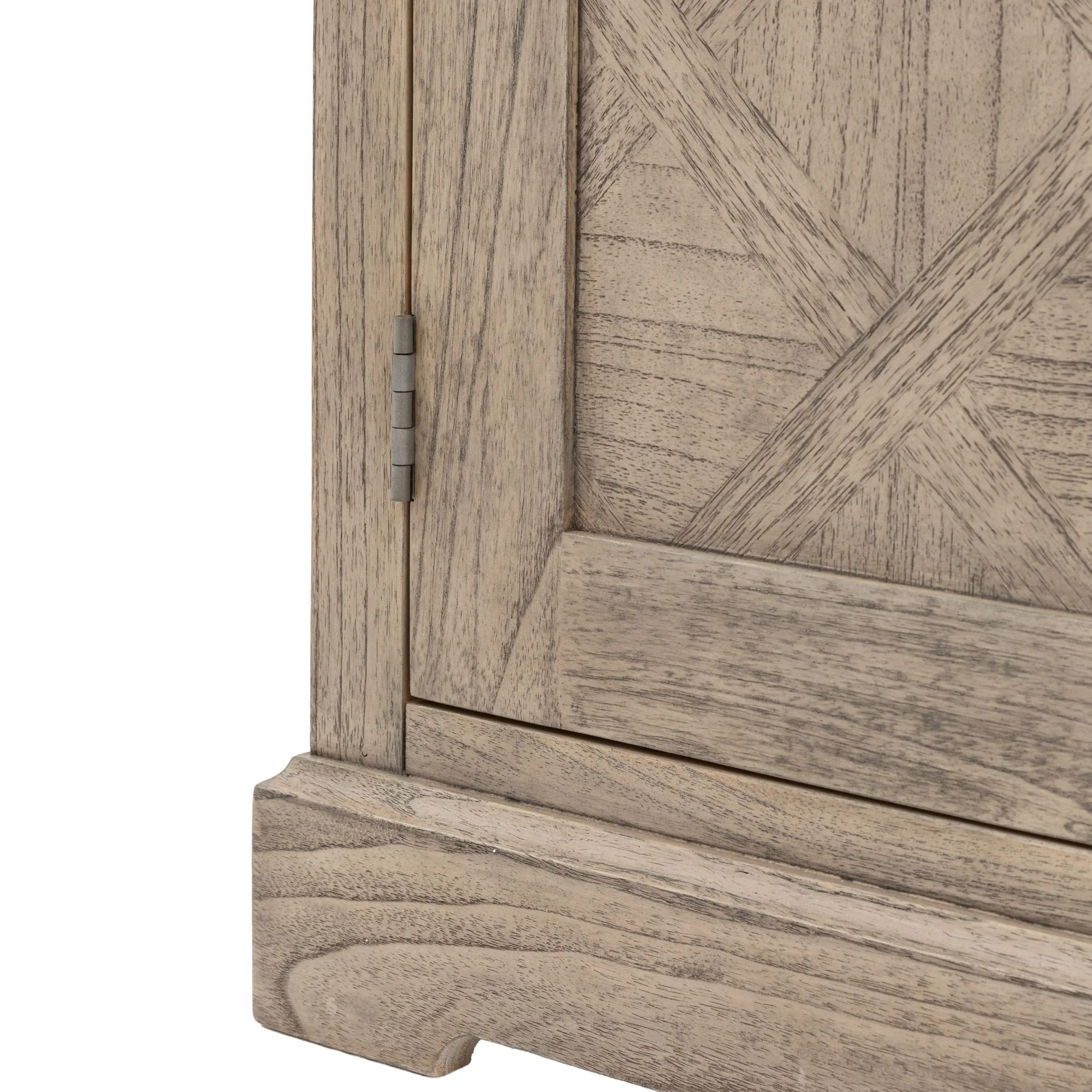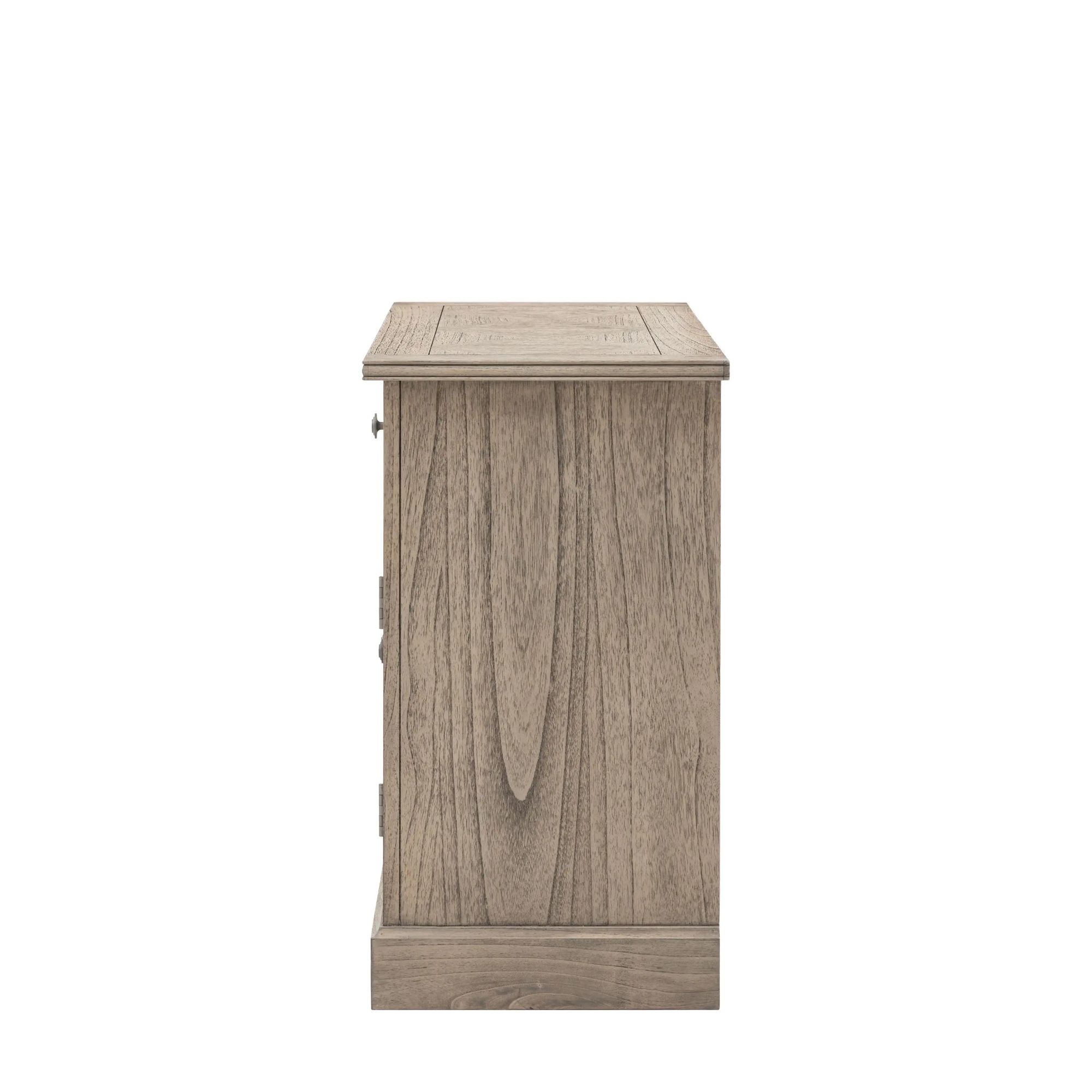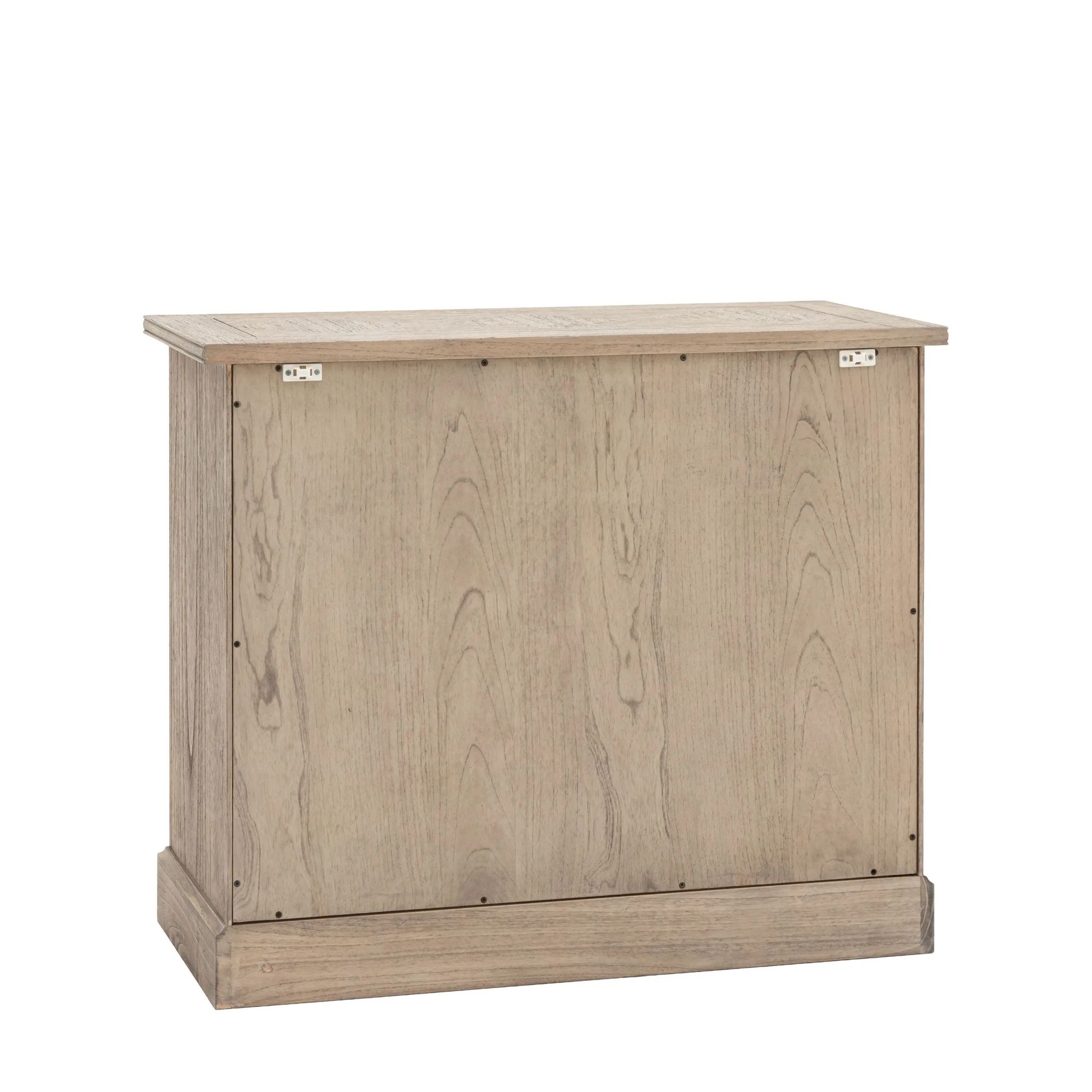 Mustique, liten elegant skjenk med en skuff i et naturlig slitt uttrykk, i hovedsak i heltre. En værbitt og rustikk finish med innlagt parkettmønster i skuff i topplate og dører. Designet er inspirert av fransk kolonistil, en tidløs og elegant rustikk liten skjenk.