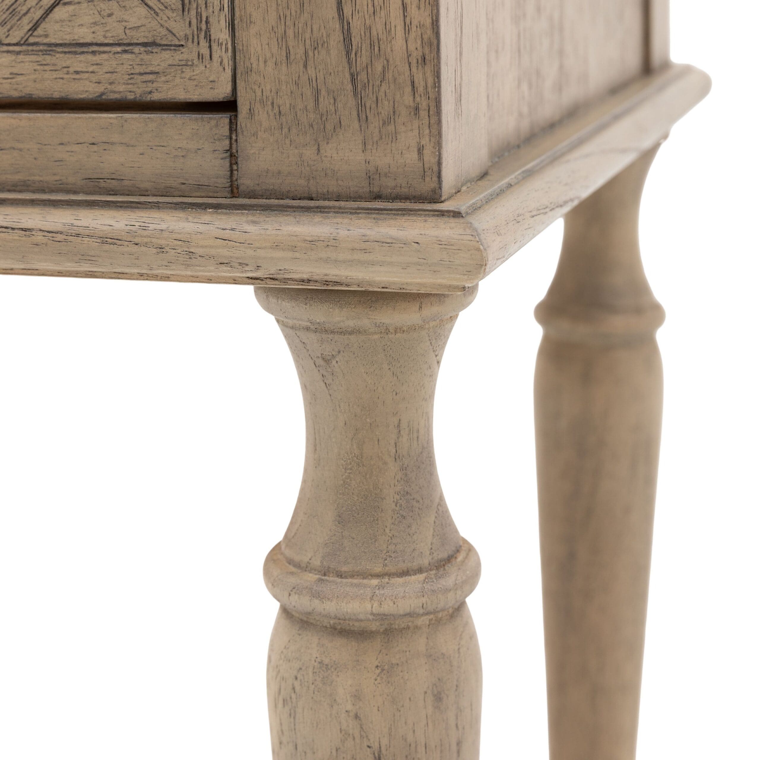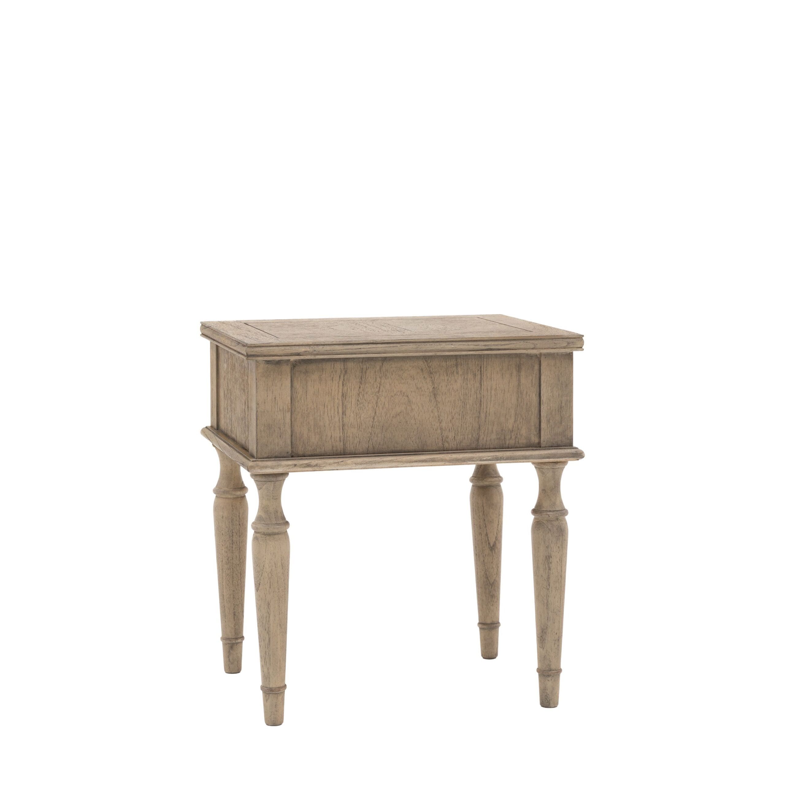 Mustique, sidebord/nattbord med en skuff i mindy ash, i en børstet naturlig finish med dekorativ innlagt mønster av finer. Det er et elegant og tidløst nattbord/sidebord i fransk kolonistil.