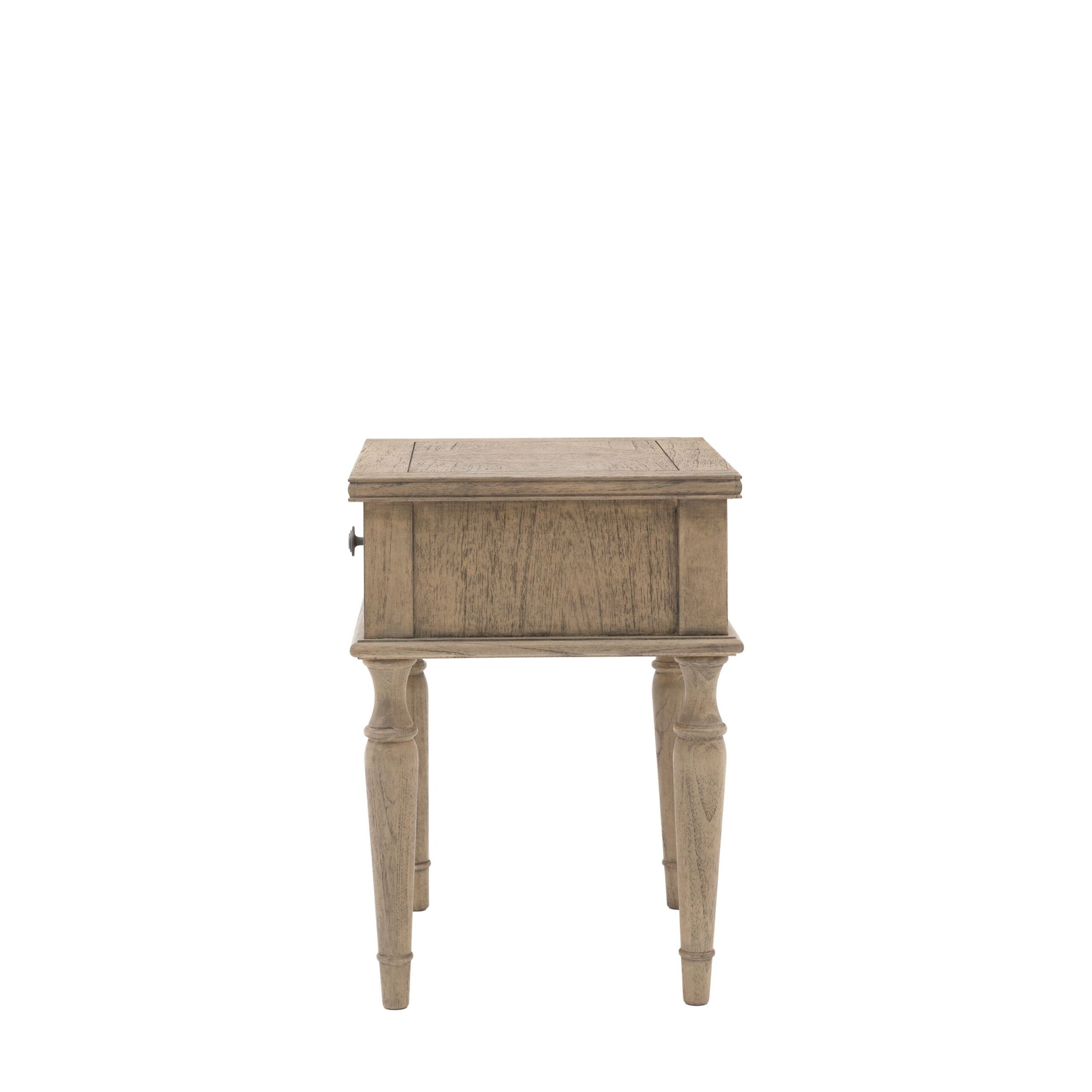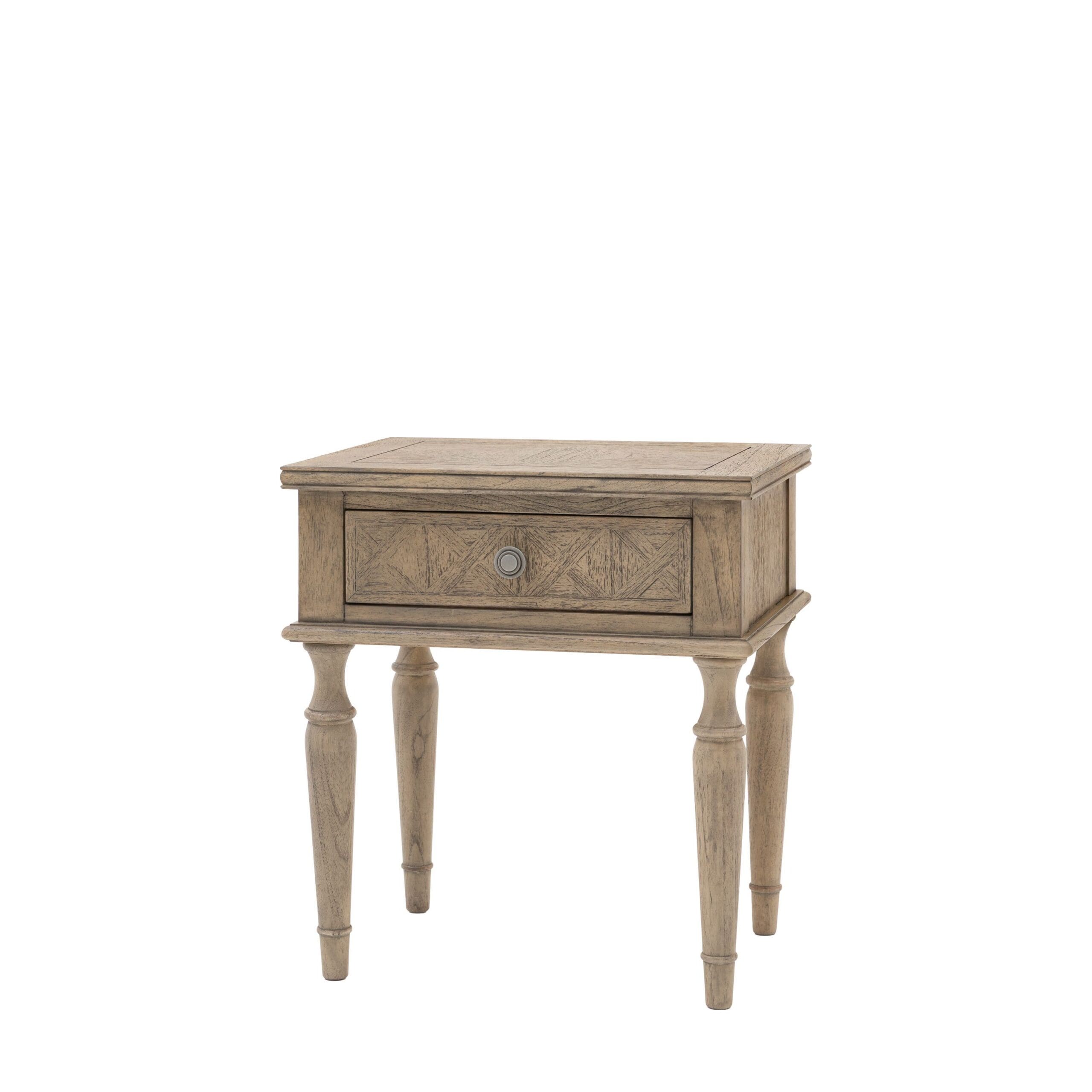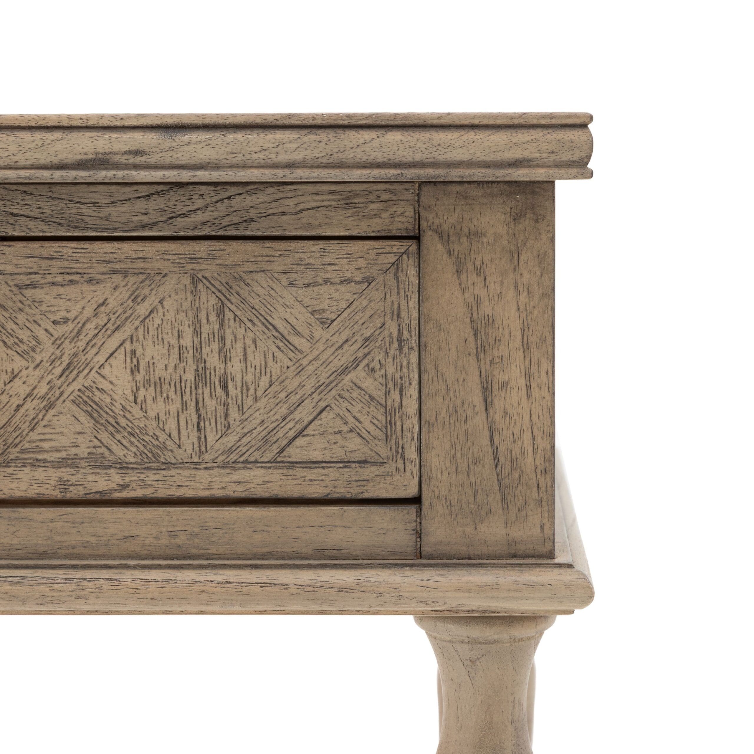 With a nod towards the french colonial style this side table is made from mindy ash and features parquet inlaid vaneer work in a lightly brushed natural finish with single drawer.